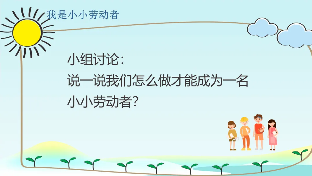 1.小组讨论:以4人小组为单位,讨论“我们怎么做才能成为一名小小劳动者?”,时间3分钟,每组推选1名代表分享。