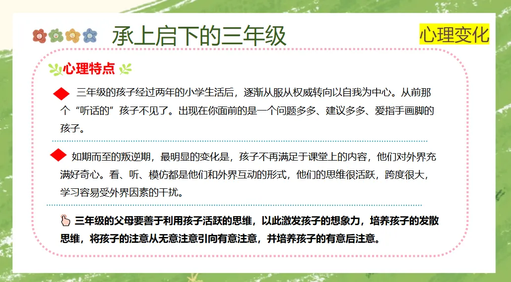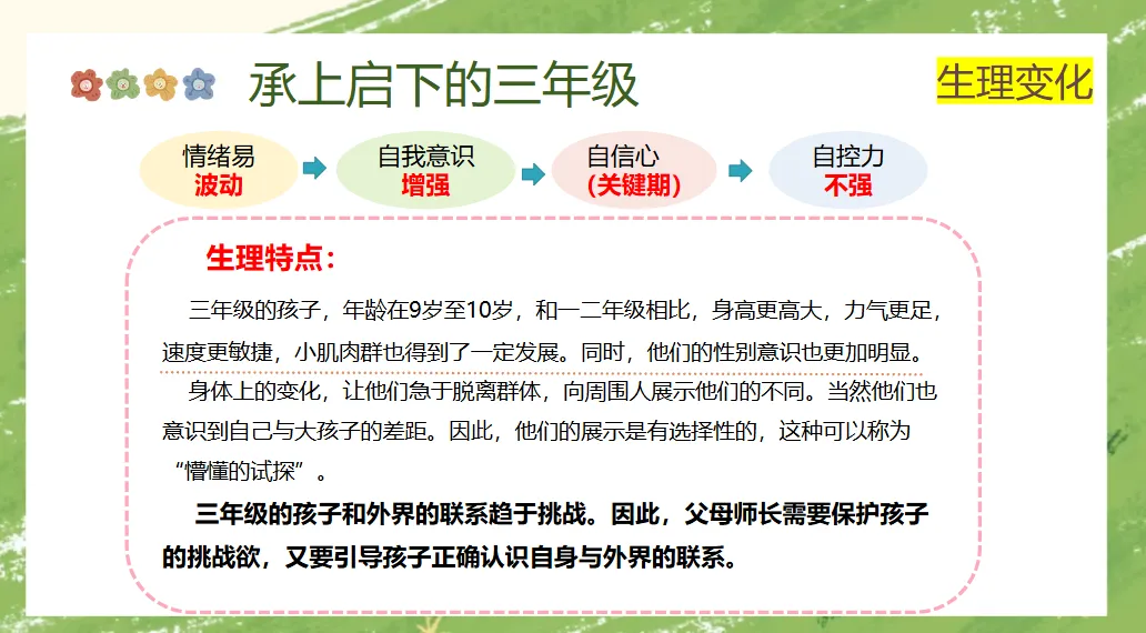 1.“转”在生理和心理特点变化明显,是培养学习能力、情绪能力、意志能力和学习习惯的最佳时期。
