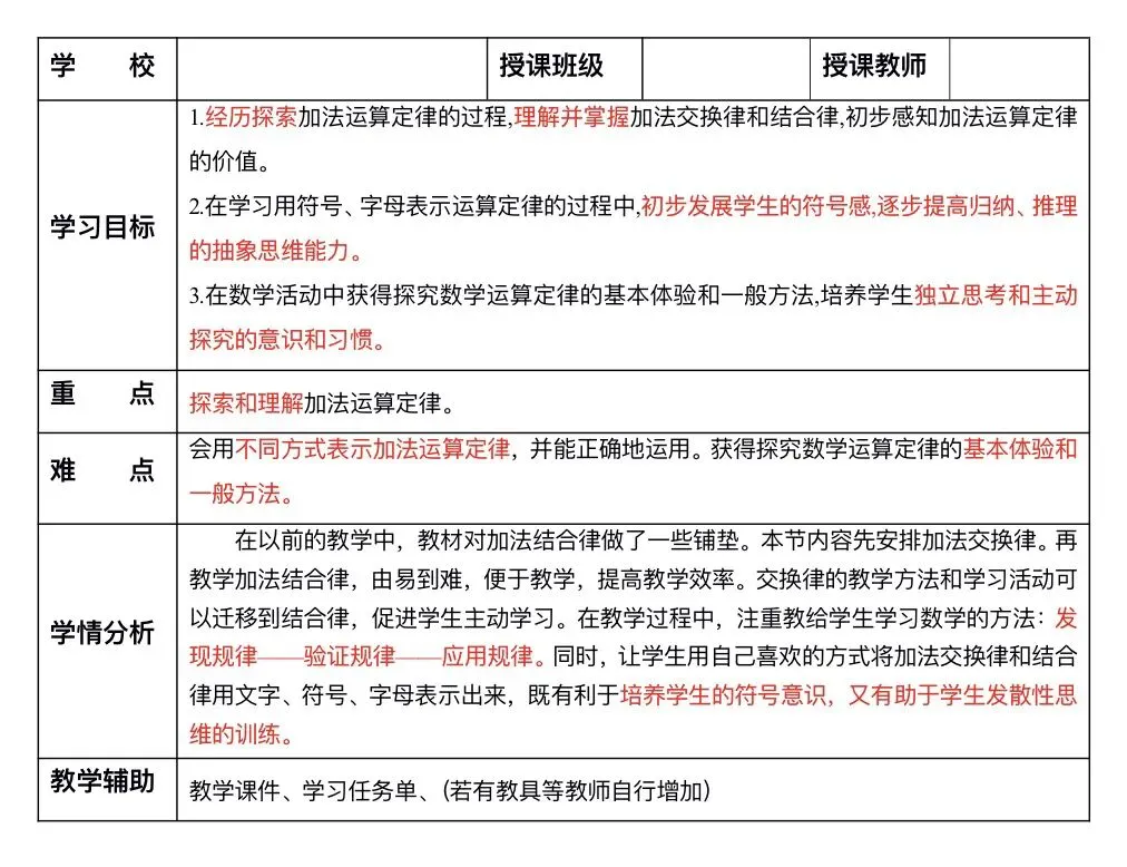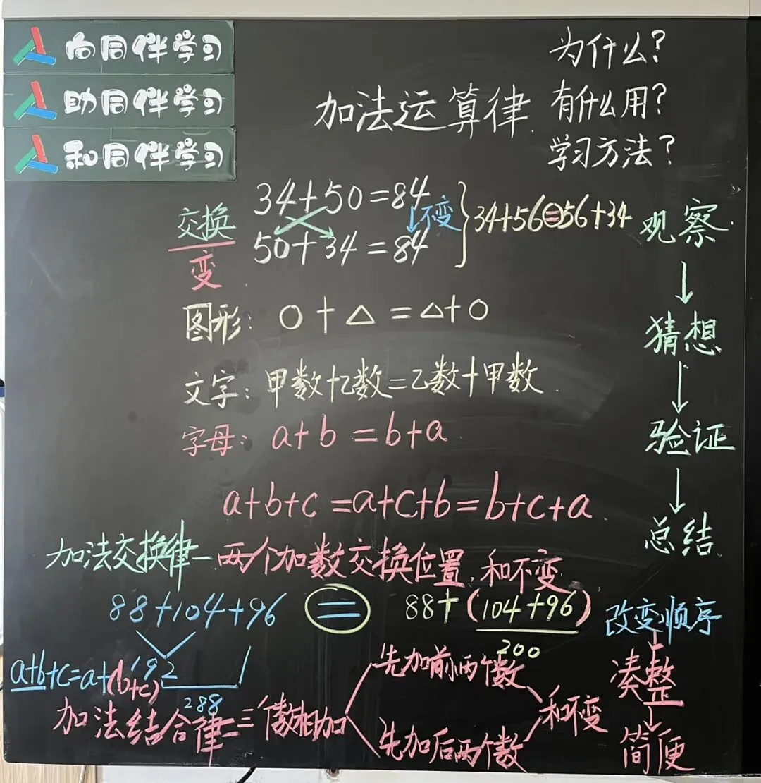 预设:有前面学加法交换律的基础,学生不会有太大困难。学生用不同的符号或字母表示加法结合律,如(△+☆)+○=△+(☆+○)等,教师都要给予肯定。
