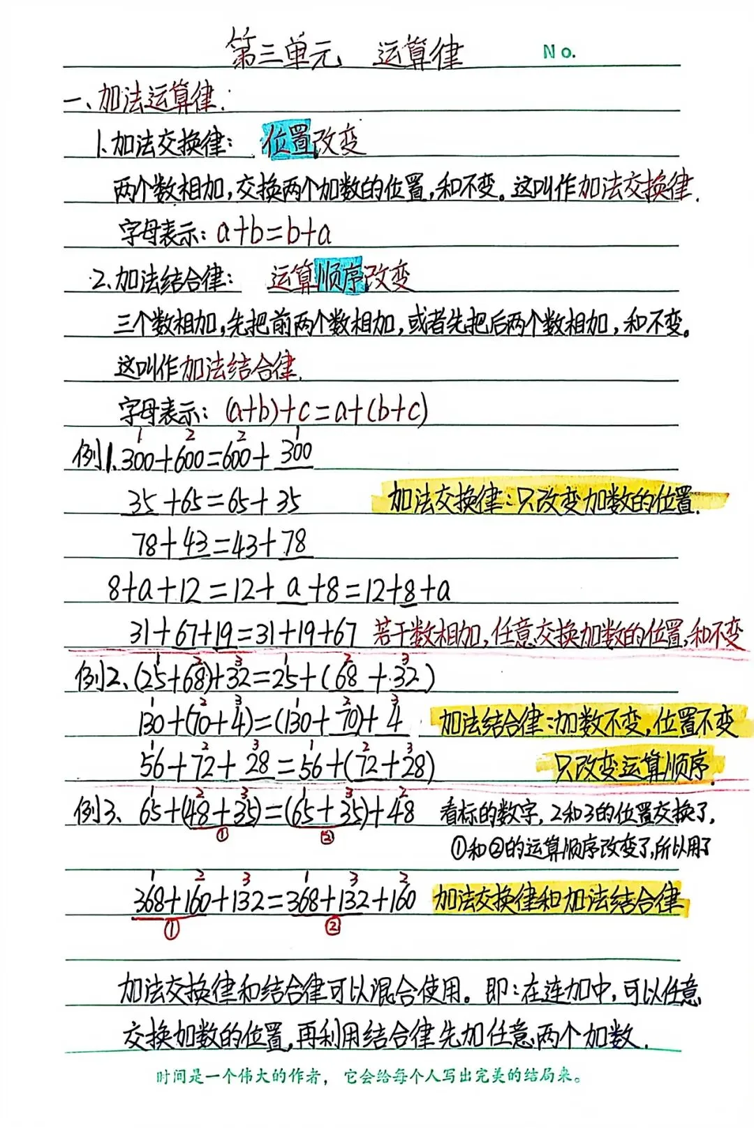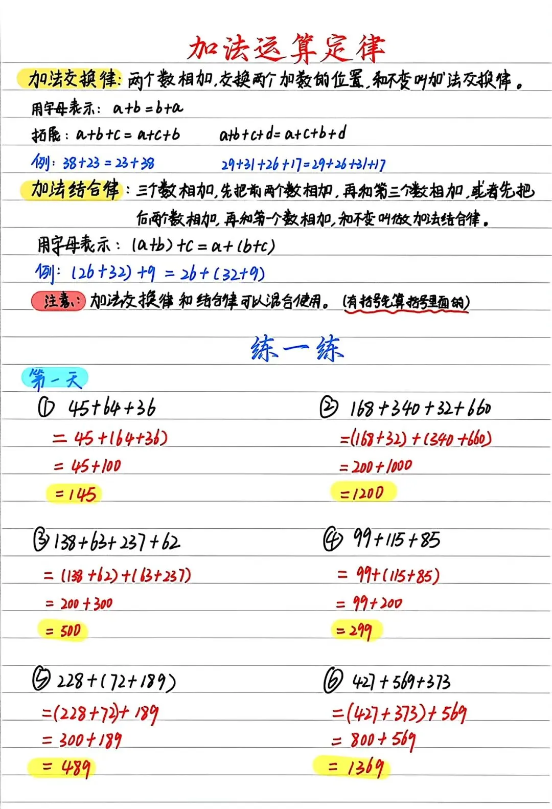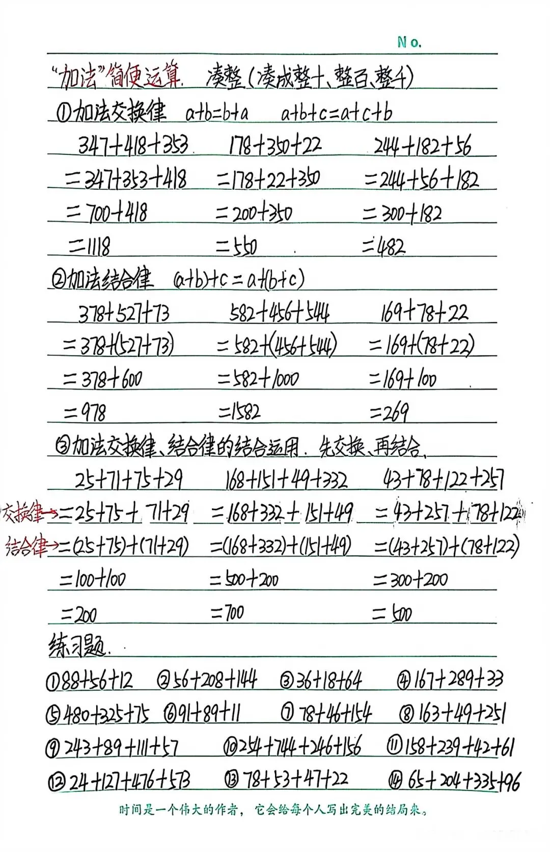 小结:加法结合律不止限于三个数相加,可以把它们推广到四个和四个以上的数相加。