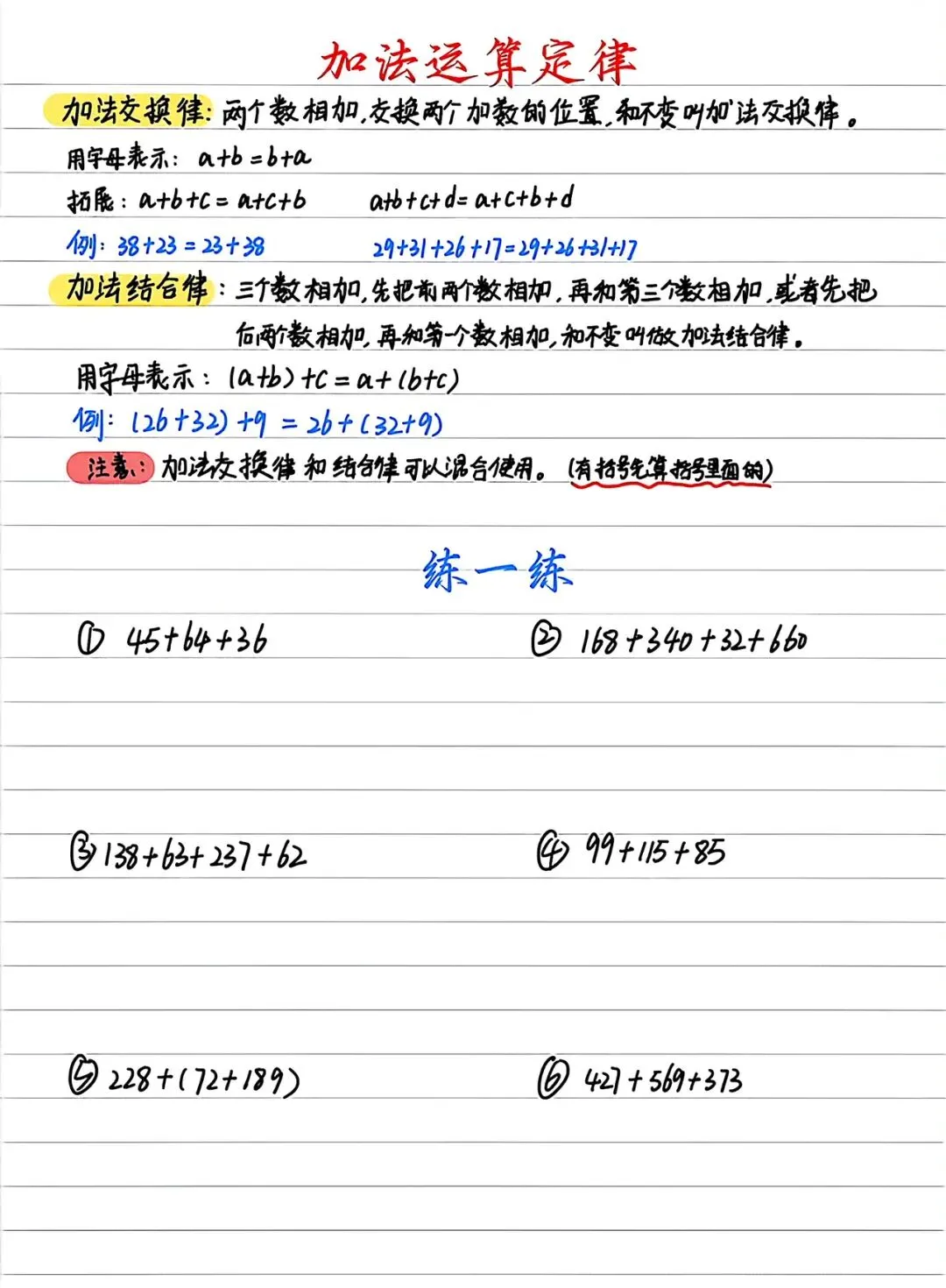 2.想一想,说一说:在刚才学习加法运算律中,有哪些注意事项?