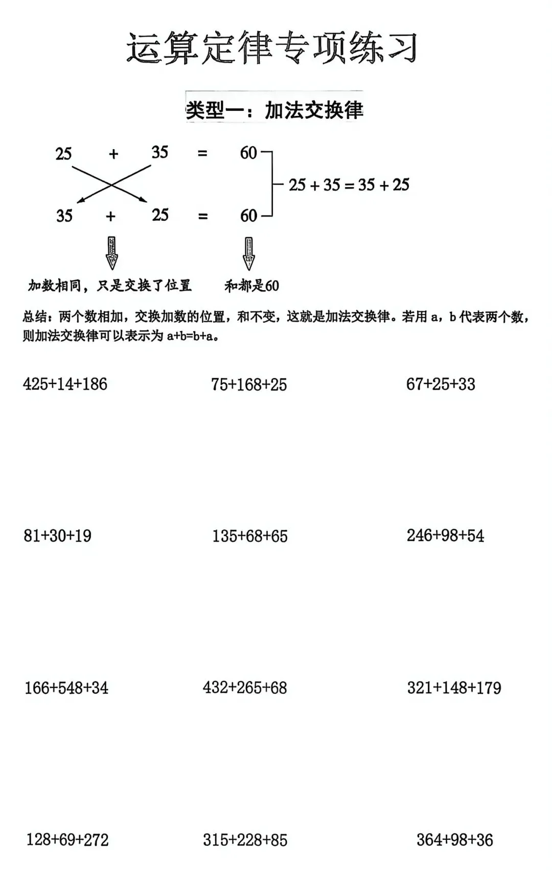 小结:若干个数相加,任意交换加数的位置,和不变。