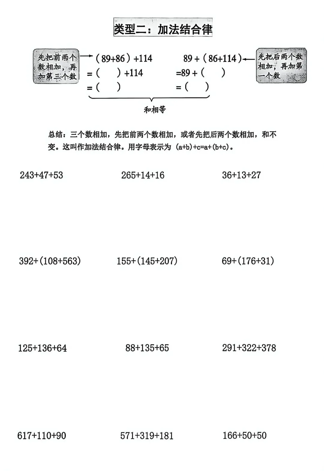 教师引导学生总结板书:三个数相加,先把前两个数相加。或者先把后两个数相加,和不变。这叫做加法结合律。