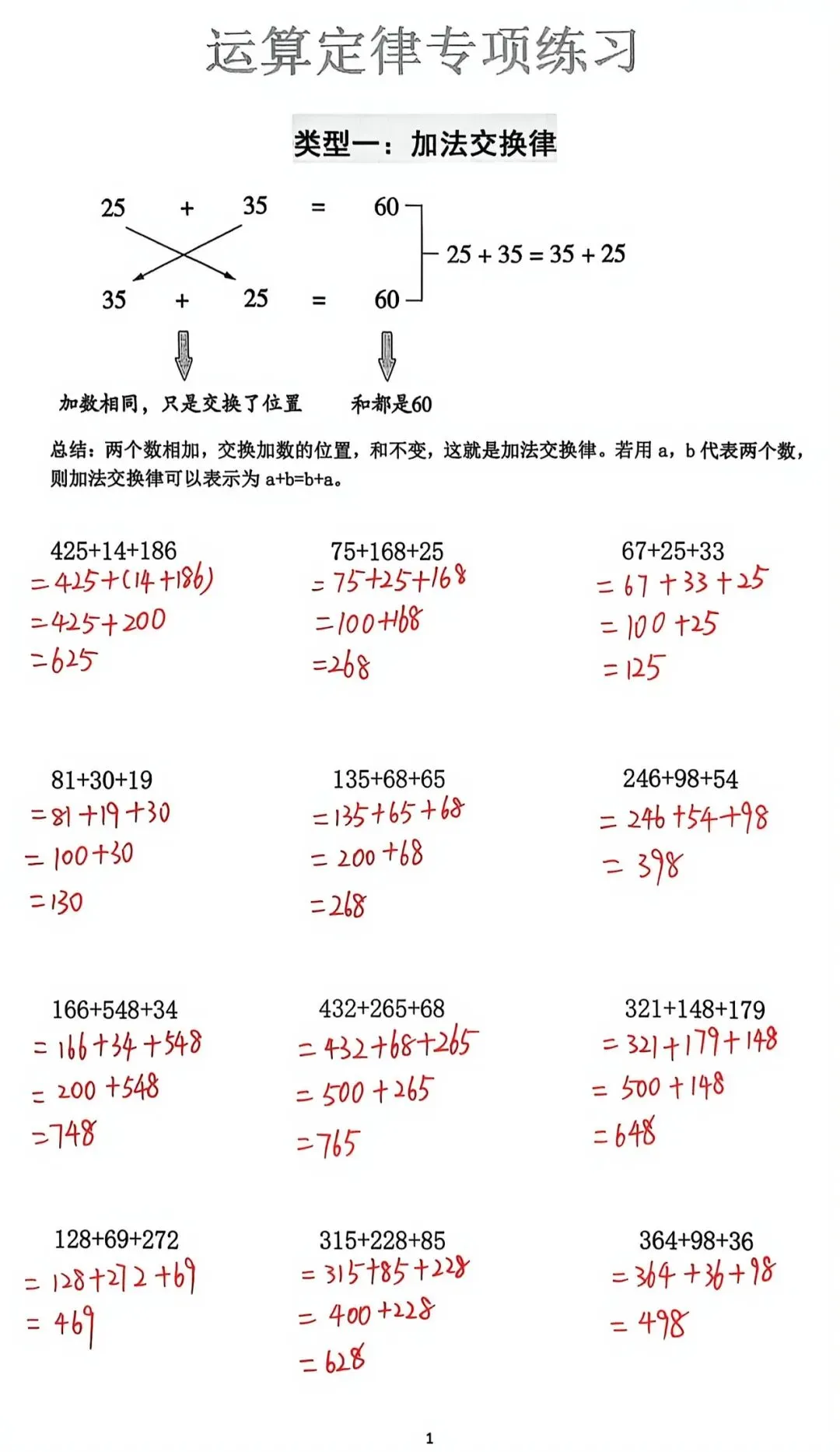 小结:加法结合律经常与加法交换律一起使用,这样可以使几个数相加时,能凑成整十、整百、整 千……的数,先交换再结合这样计算比较简便。