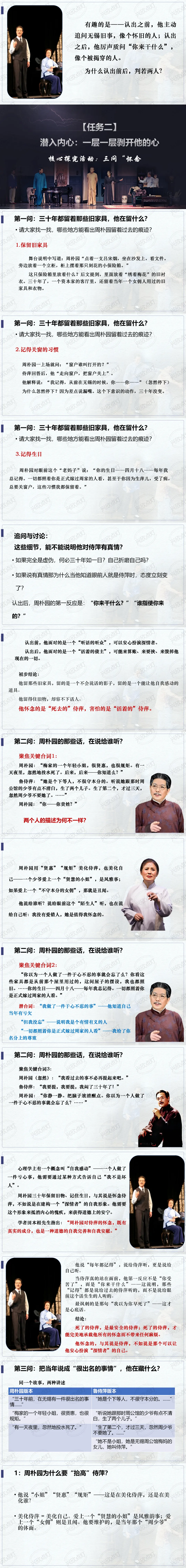本课的教学核心在于通过戏剧语言(台词、潜台词)和舞台说明,透视人物复杂的内心世界。尤其是周朴园这一形象,绝不能简单地用“虚伪”二字概括。正如曹禺本人所言,他笔下的人物都是有血有肉的活人。而理解周朴园的关键,或许就藏在这个问题里:三十年,他到底在怀念什么? 是怀念那个人,还是怀念自己的青春?是怀念一段真情,还是怀念一种可以安心自处的体面?带着这个问题走进文本,我们将触摸到人性最幽微复杂的地带。