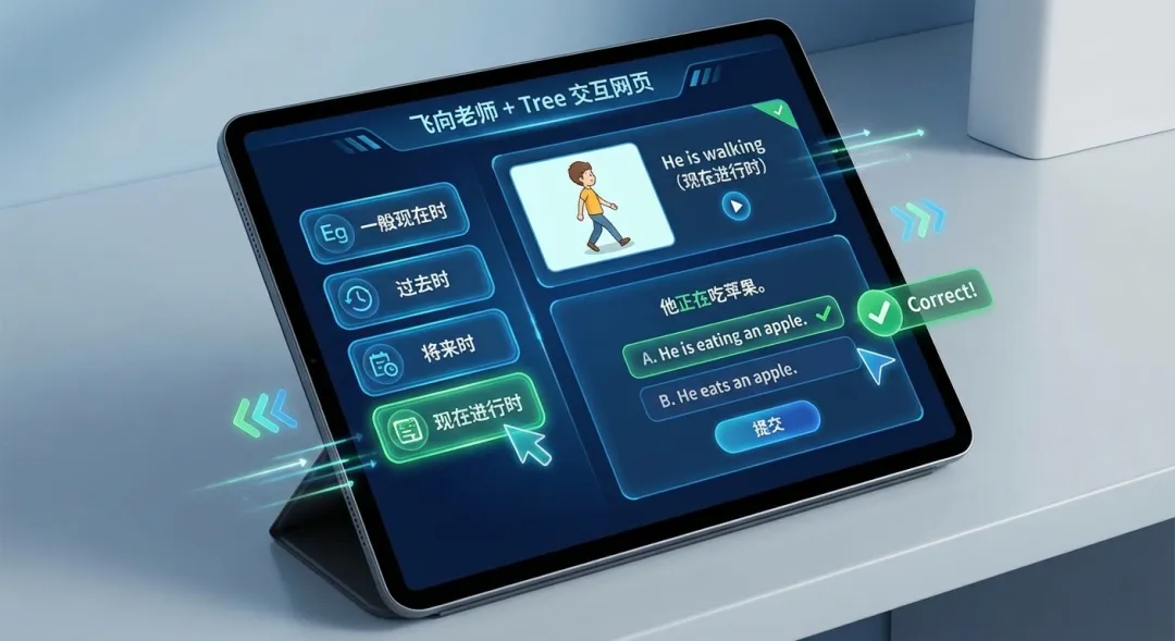 从静态到交互的跨越: 利用飞象老师(FlyElephant)和 Tree 工具,将零碎的 AI 图片一键转化为具备导航、答题和解析功能的交互式网页。