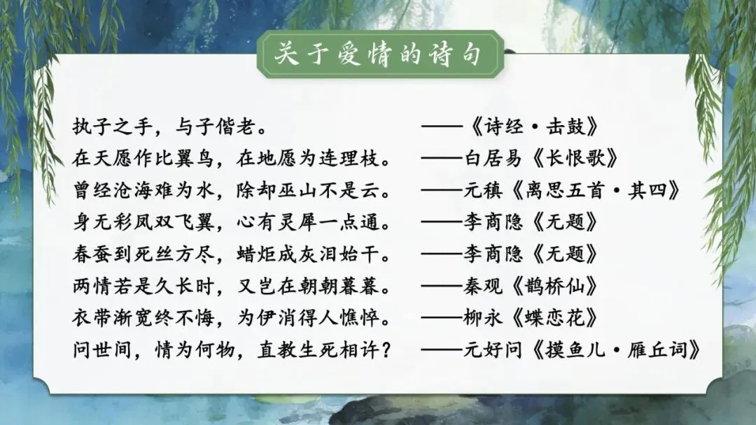阅读这些诗文,能够让我们了解古人的思想、情趣,感受他们的智慧,受到美的熏陶和感染。让我们对爱情有一份向往,带着虔诚的心去感受那份跨越千年的美好!