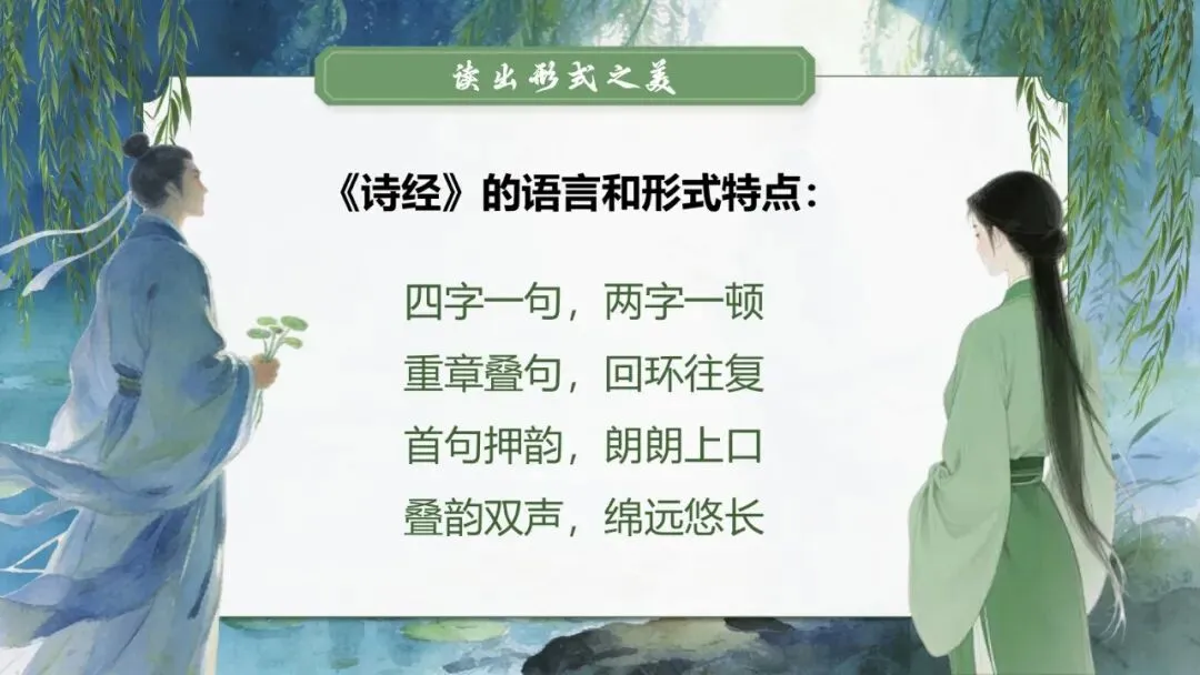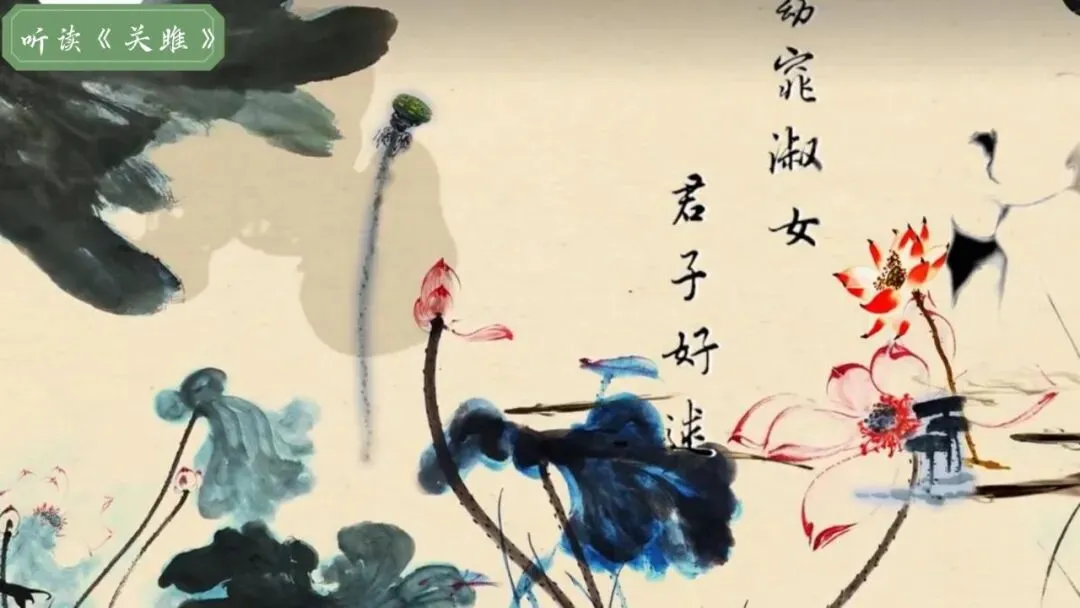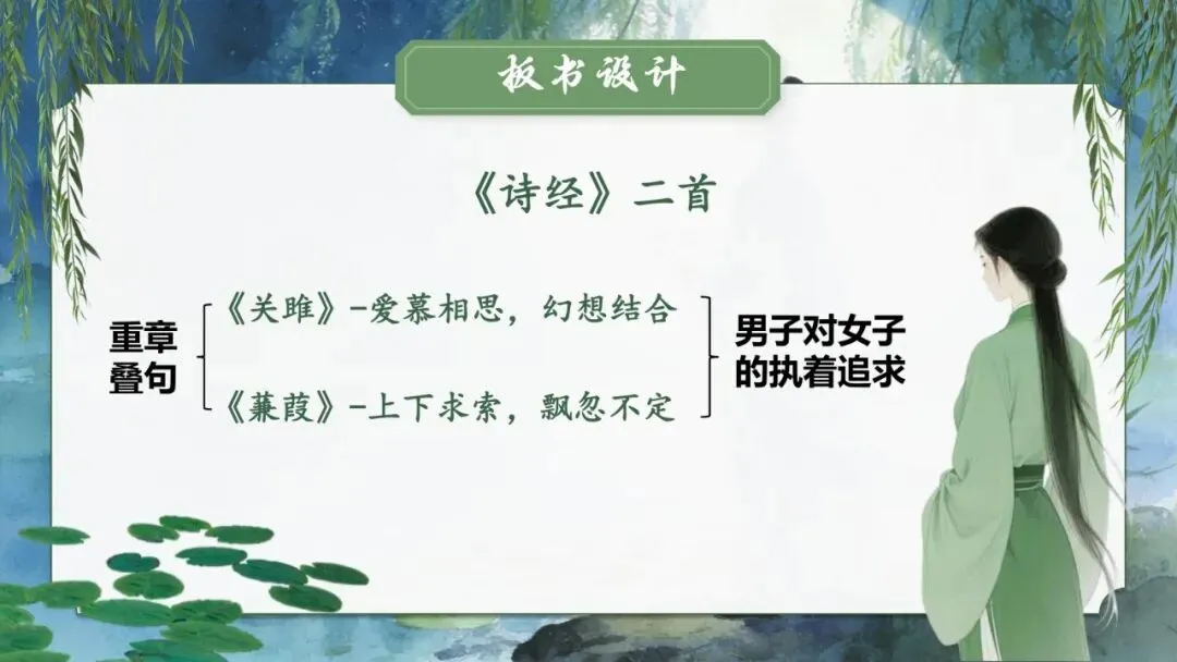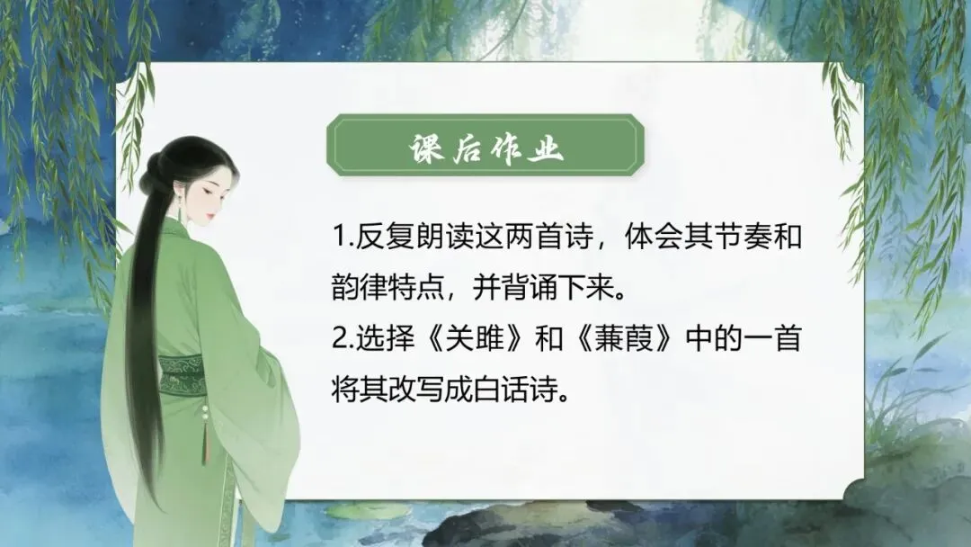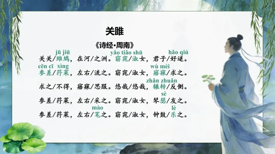 播放《关雎》《蒹葭》配乐朗诵,注意节奏与情感。