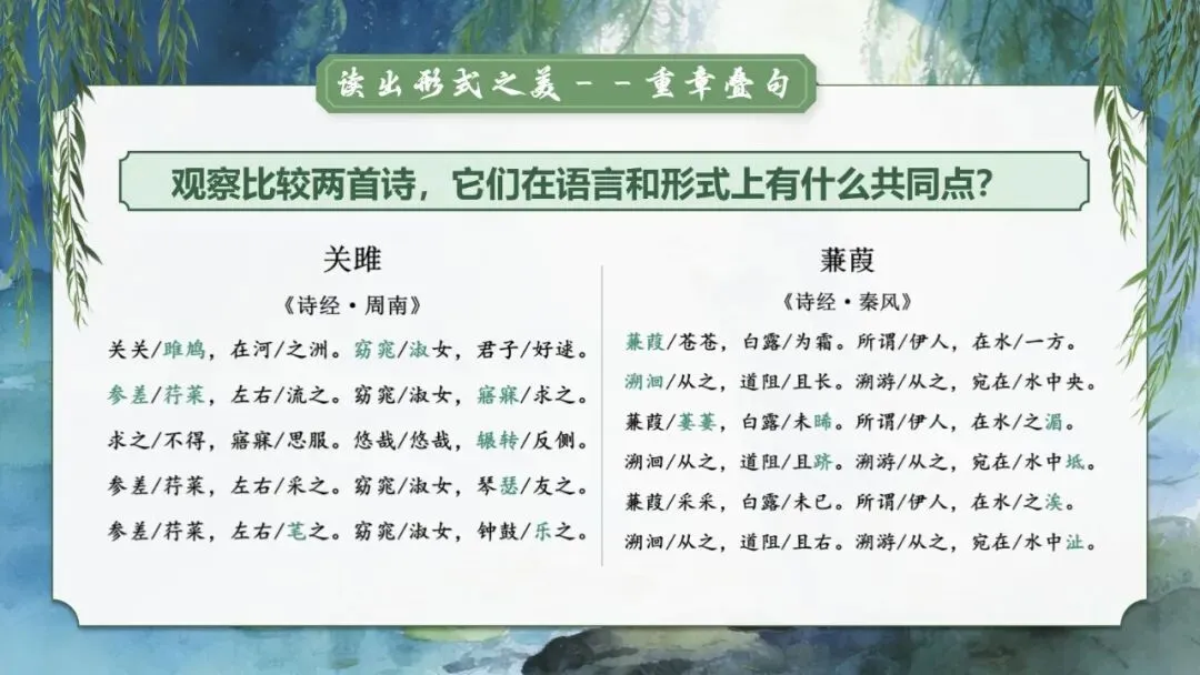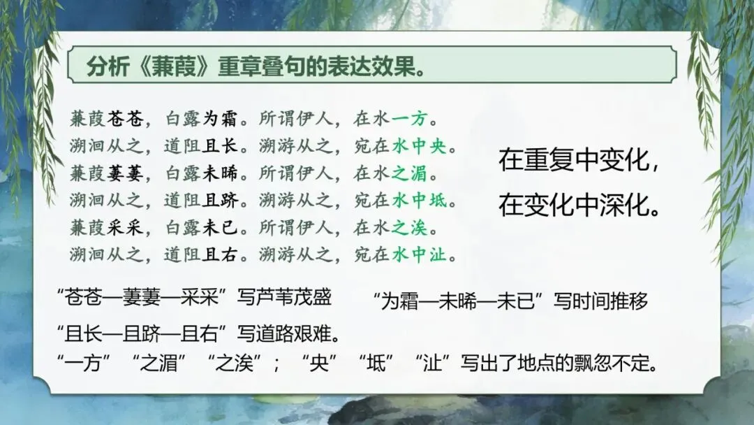 点拨: "苍苍—萋萋—采采"写芦苇茂盛,"为霜—未晞—未已"写时间推移,"且长—且跻—且右"写道路艰难——在重复中变化,在变化中深化。