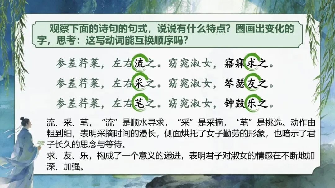 流、采、芼,“流”是顺水寻求,“采”是采摘,“芼”是挑选。动作由粗到细,表明采摘时间的漫长,侧面烘托了女子勤劳的形象,也暗示了君子长久的思念与等待。