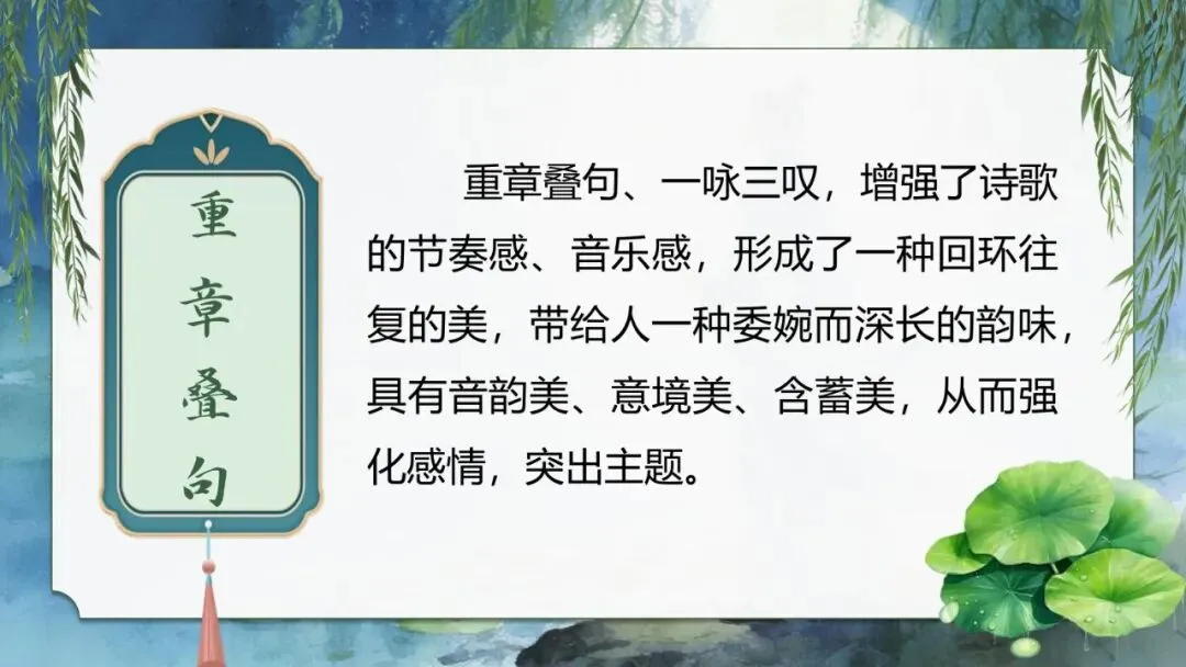 小结:重章叠句、一咏三叹,增强了诗歌的节奏感、音乐感,形成了一种回环往复的美,带给人一种委婉而深长的韵味,具有音韵美、意境美、含蓄美,从而强化感情,突出主题。