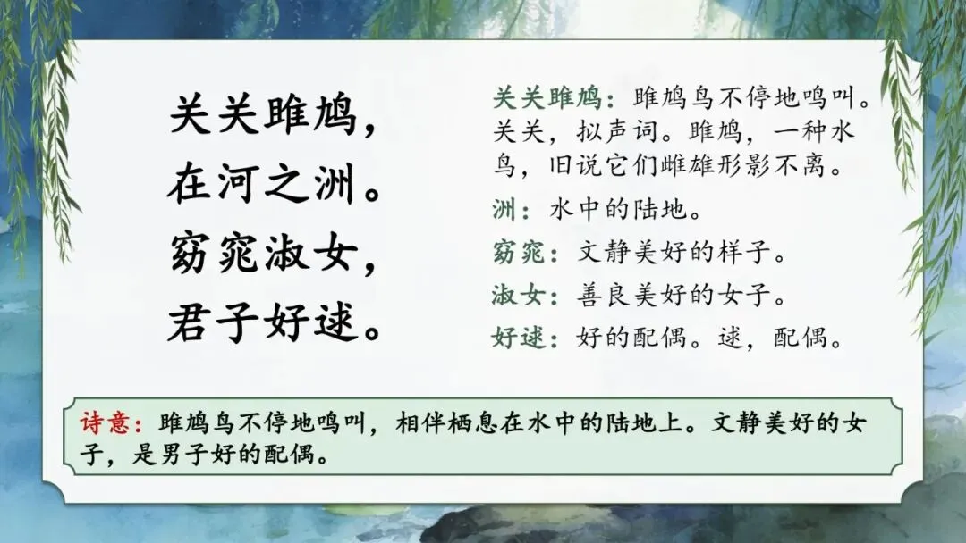 关关/雎鸠(jū jiū),在河/之洲。窈窕(yǎo tiǎo)/淑(shū)女,君子/好逑(hǎo qiú)。