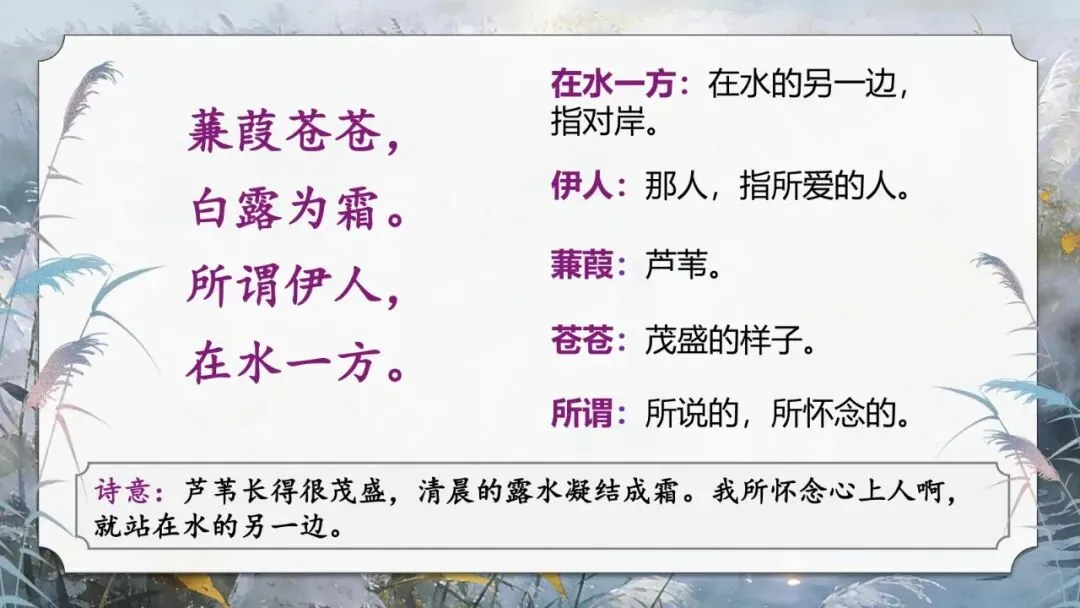 蒹葭/萋萋(qī),白露/未晞(xī)。所谓/伊人,在水/之湄(méi)。