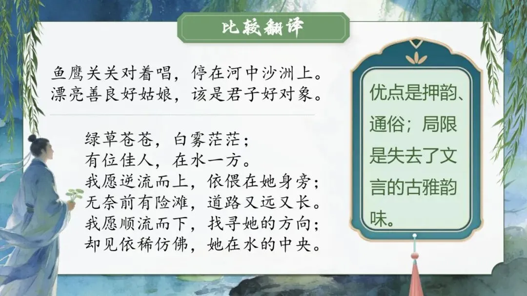 化传承:理解古人对美的认识和追求,感悟《诗经》中含蓄、中和的爱情观,增强对中华优秀传统文化的认同。