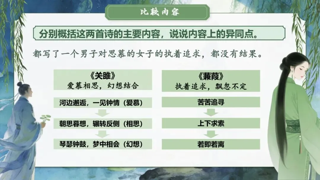 文本特色:两首诗都采用四言句式、重章叠句的结构,运用比兴手法,语言质朴而富有韵律美。《关雎》情感明朗热烈,由爱慕到相思再到幻想,层层递进;《蒹葭》意境朦胧凄美,以景起兴,虚实相生,给人以无限遐想空间。