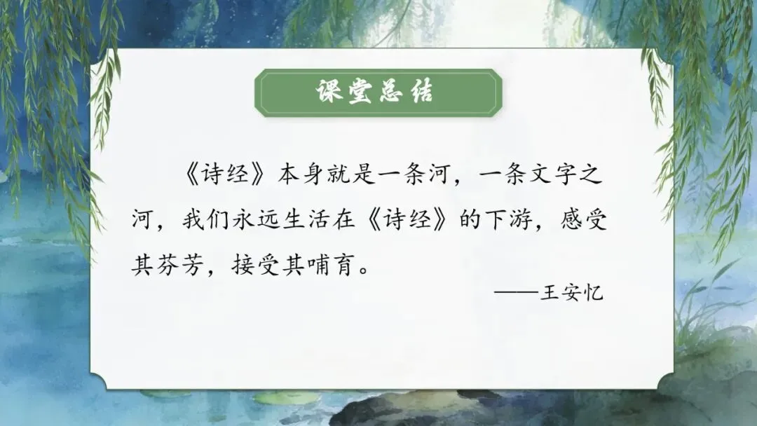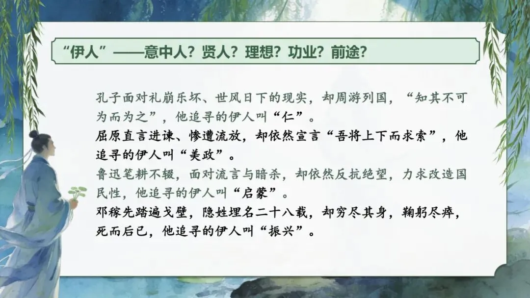 小结:孔子追寻的“仁”、屈原追寻的“美政”,都是他们心中的“伊人”,《蒹葭》的意境早已超越爱情,成为对美好事物执着追求的文化符号。