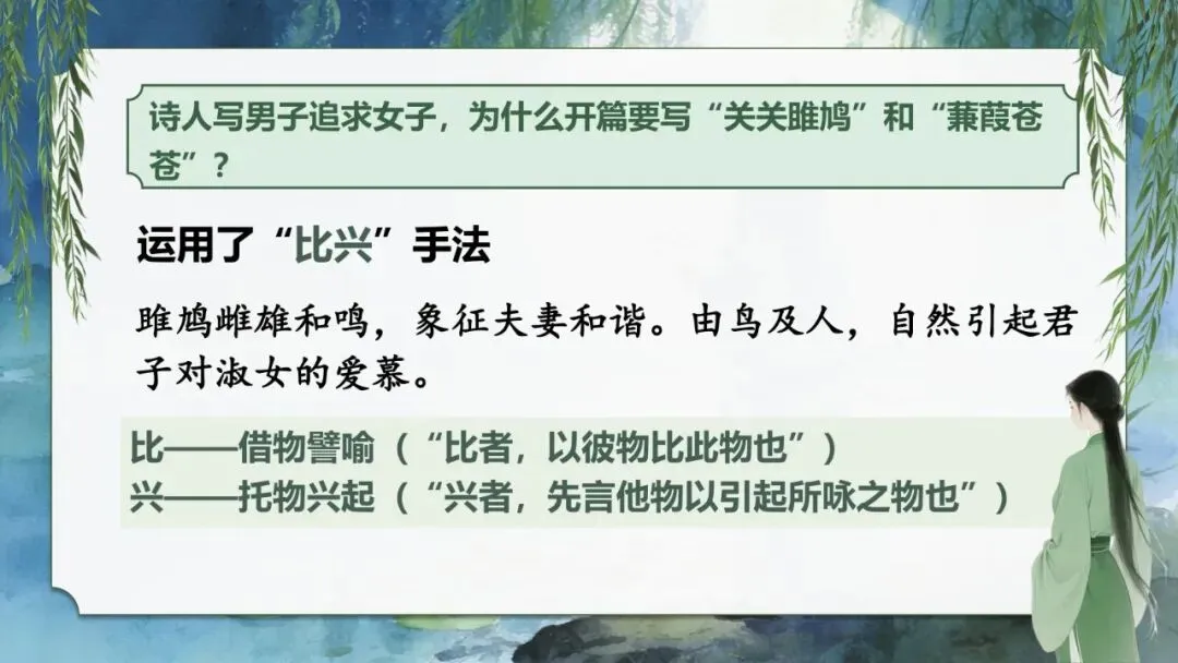 难点:理解古人对美的认识和追求,体会《诗经》爱情诗中蕴含的含蓄美、中和美。