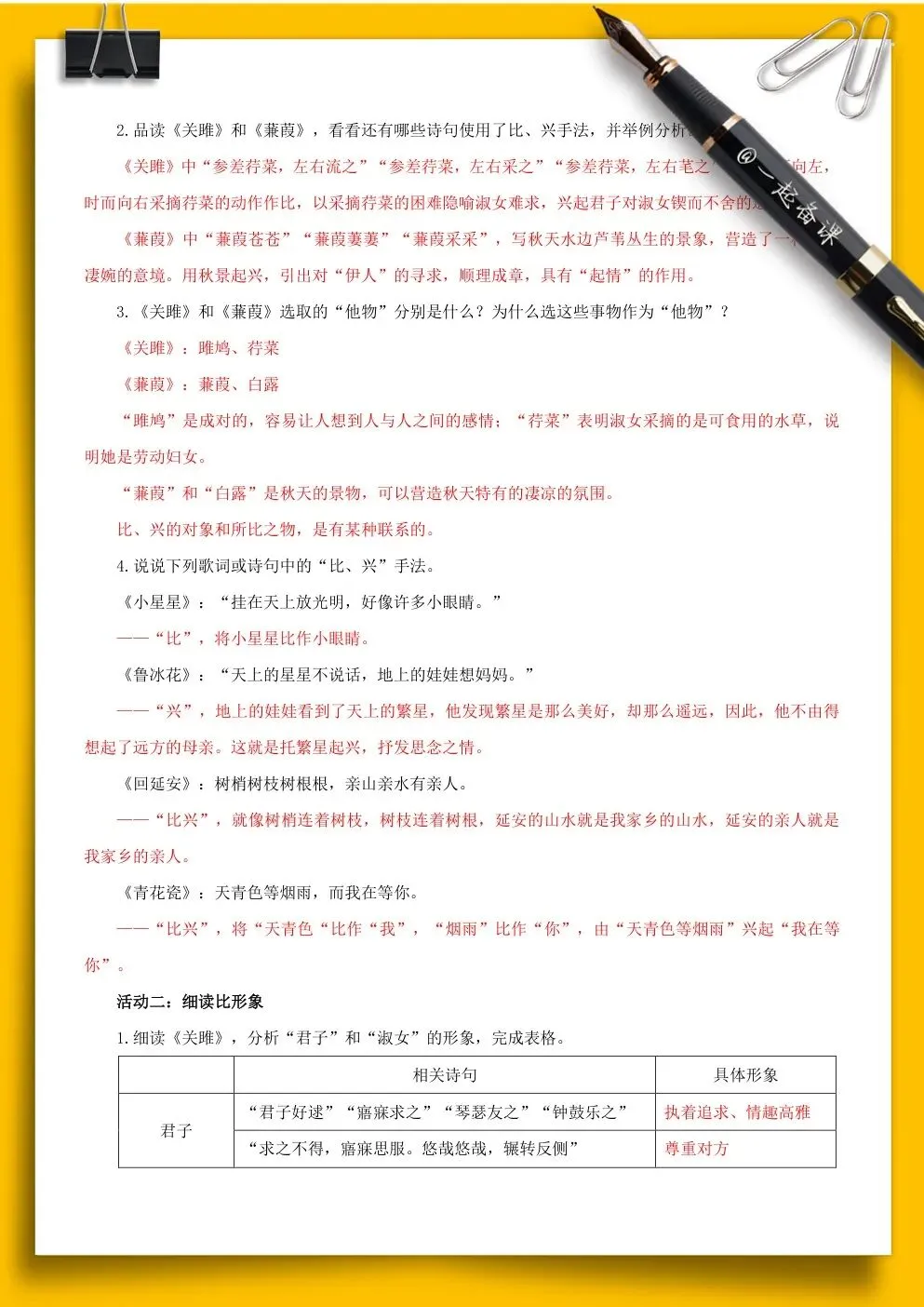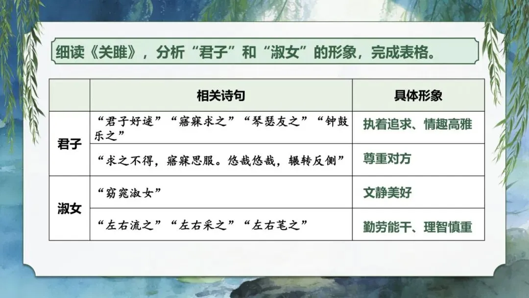 1.细读《关雎》,分析“君子”和“淑女”的形象,完成表格。