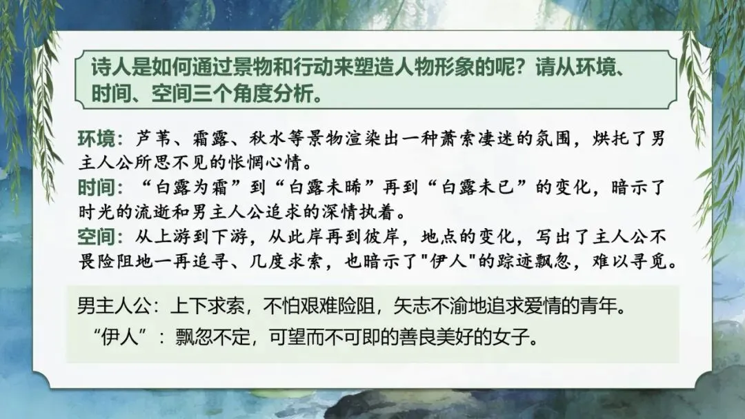 师:《蒹葭》的妙处在于"不着一字,尽得风流"。诗人是如何通过景物和行动来塑造人物形象的呢?请从环境、时间、空间三个角度分析。