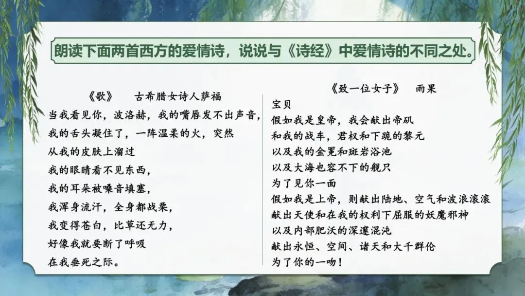 1.朗读下面两首西方的爱情诗,说说与《诗经》中爱情诗的不同之处。