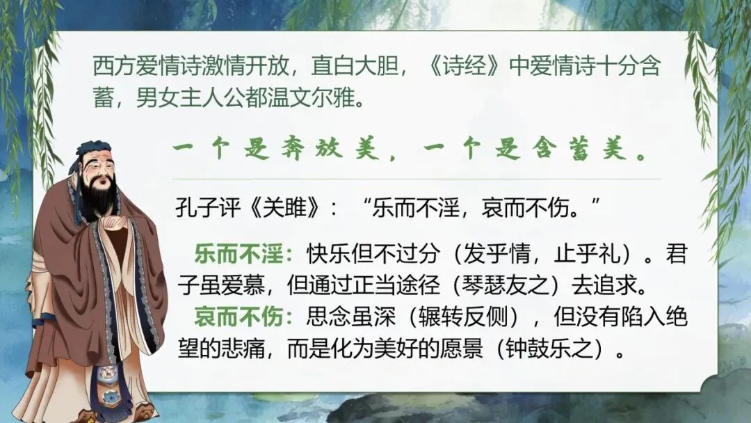 过渡:西方爱情诗更直白热烈,《诗经》的爱情诗“乐而不淫,哀而不伤”,体现中国传统的“中和之美”——正如孔安国所言: