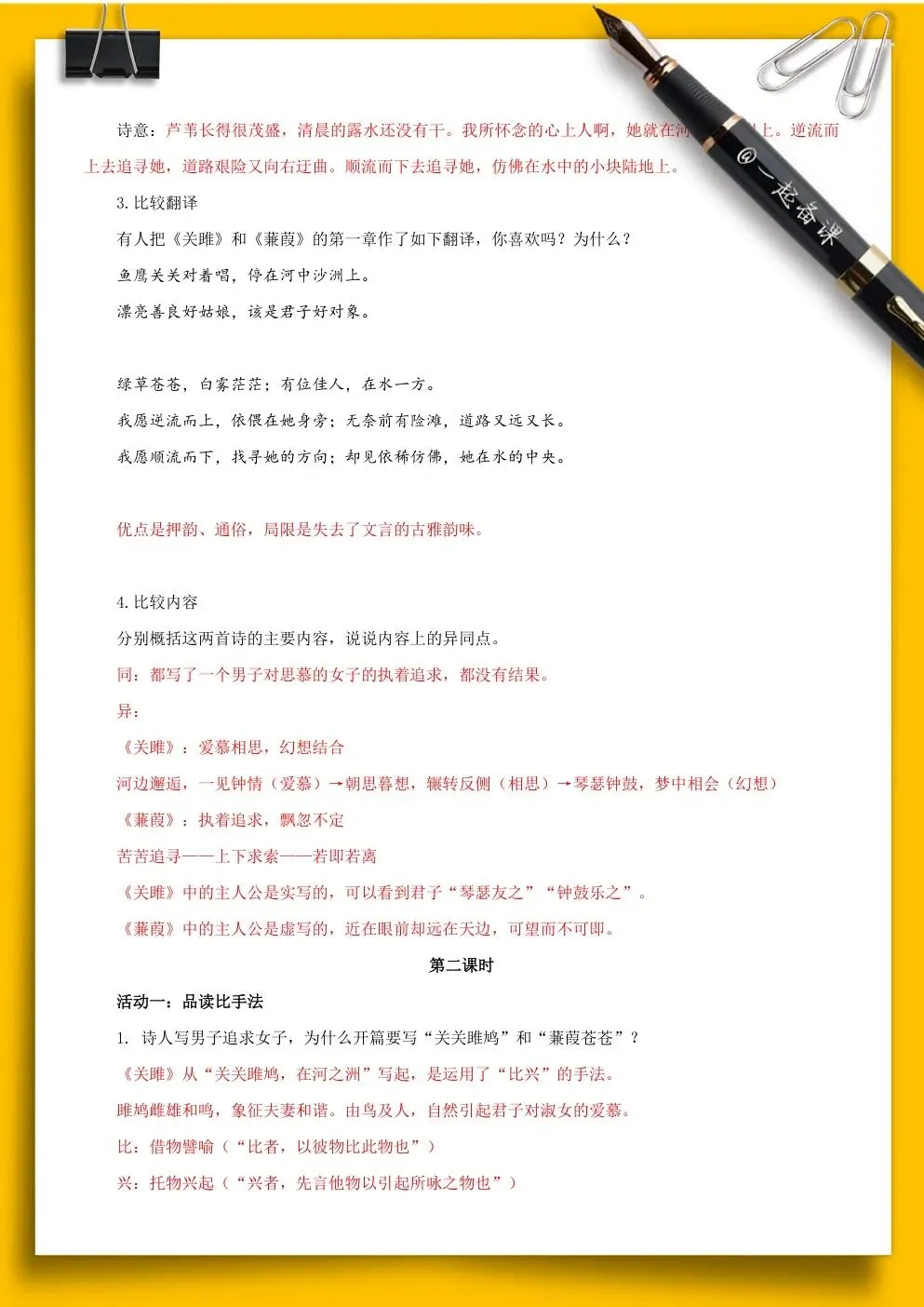 思维发展:分析重章叠句的结构特点和比、兴的表现手法,把握两首诗在情感表达和意境营造上的异同。