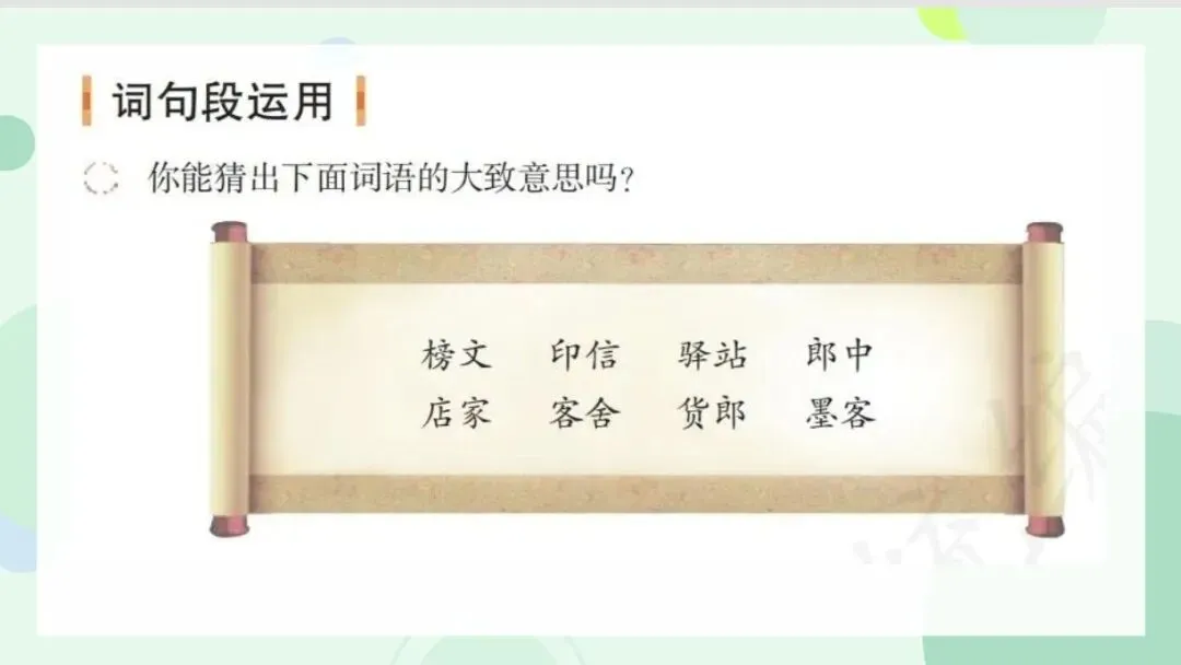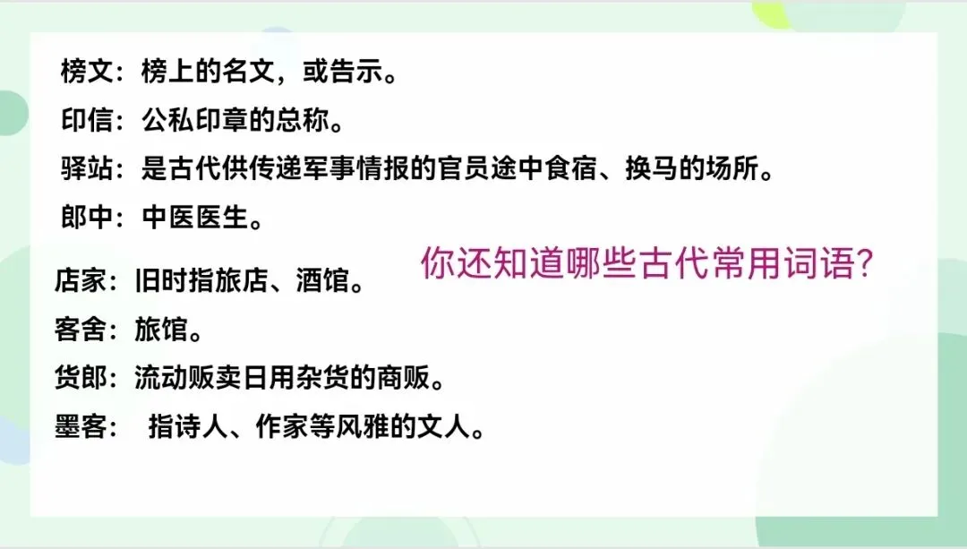 你是怎样猜出来的呢?你还知道哪些古代常用词语呢?如:书生、红颜、官人、布衣、私塾…