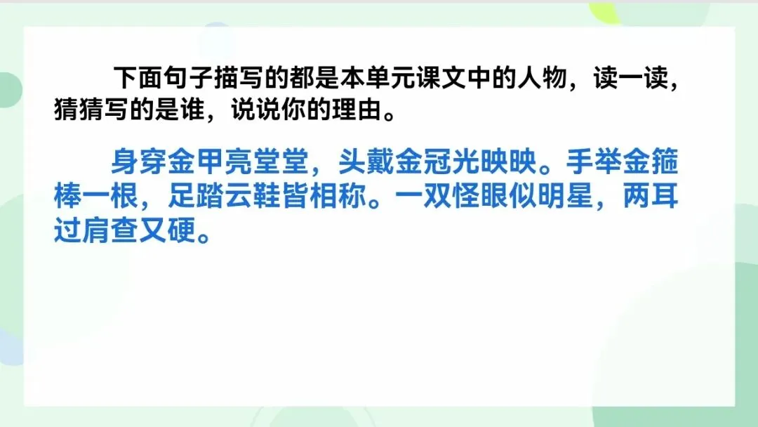 下面的句子描写的都是本单元课文中的人物,读一读,猜猜写的是谁,说说你的理由(抓住关键点)