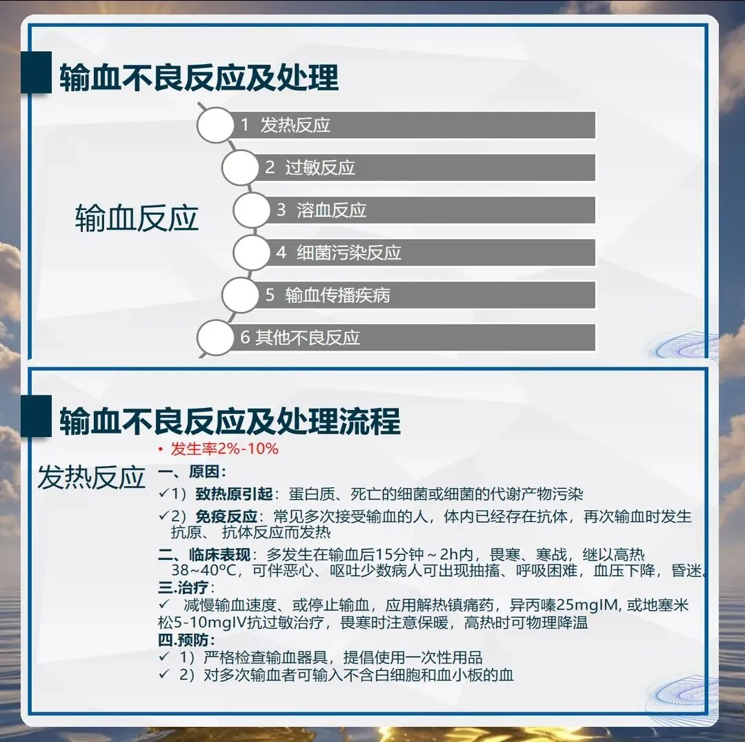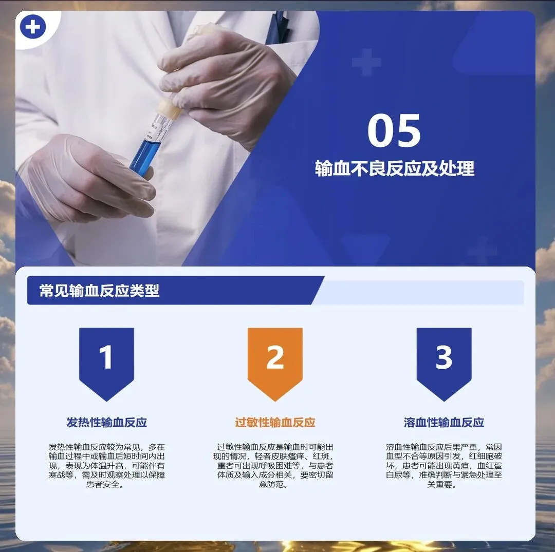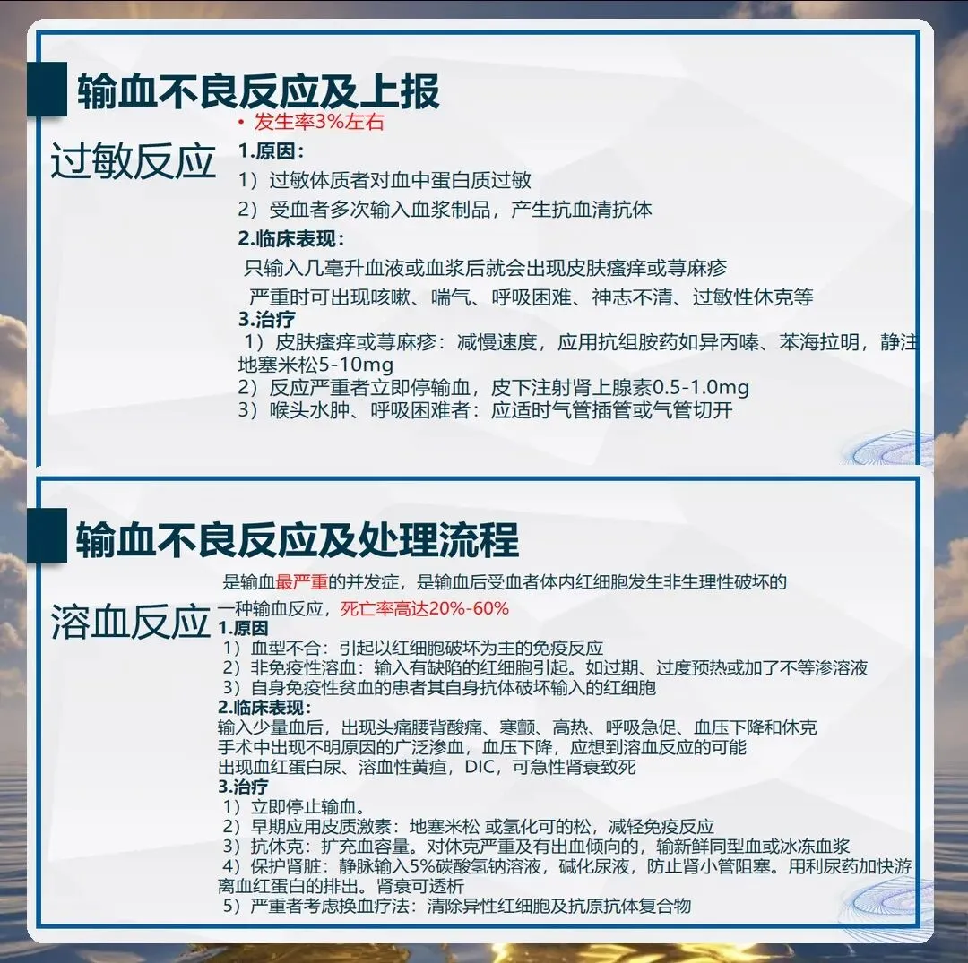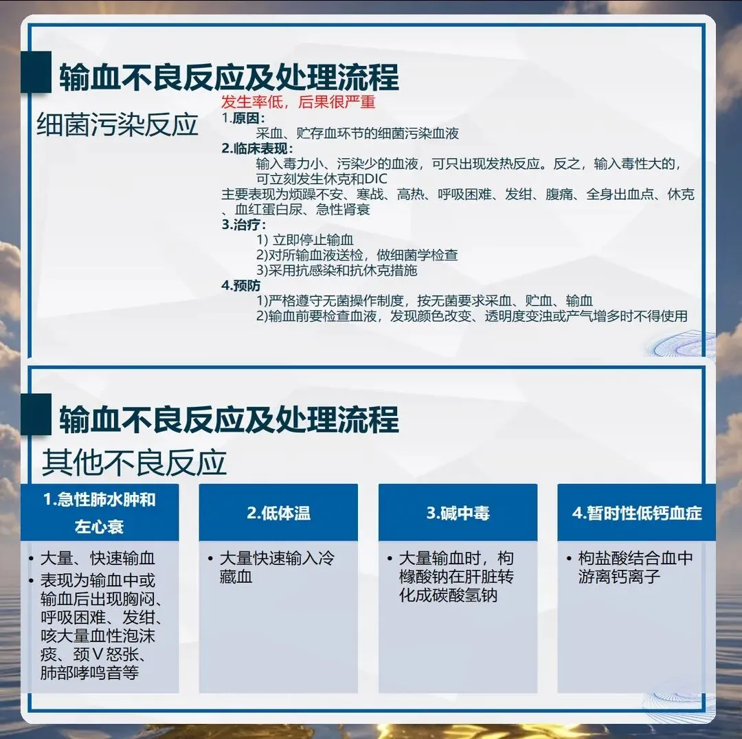 输血不良反应的处理要及时准确。急性溶血反应是最严重的输血并发症,多由血型不合引起,起病急、进展快,可导致休克、肾衰竭、死亡。一旦发生立即停止输血,保持静脉通路通畅,快速补液、利尿、碱化尿液,保护肾功能。过敏反应轻者口服抗组胺药物,重者肌注肾上腺素,保持呼吸道通畅。循环超负荷多见于老年、心功能不全、输血速度过快的患者,表现为呼吸困难、咳嗽、咳粉红色泡沫痰,立即停止输血、半卧位、吸氧、利尿。输血相关急性肺损伤通常在输血六小时内发生,表现为急性呼吸窘迫,需要机械通气支持。