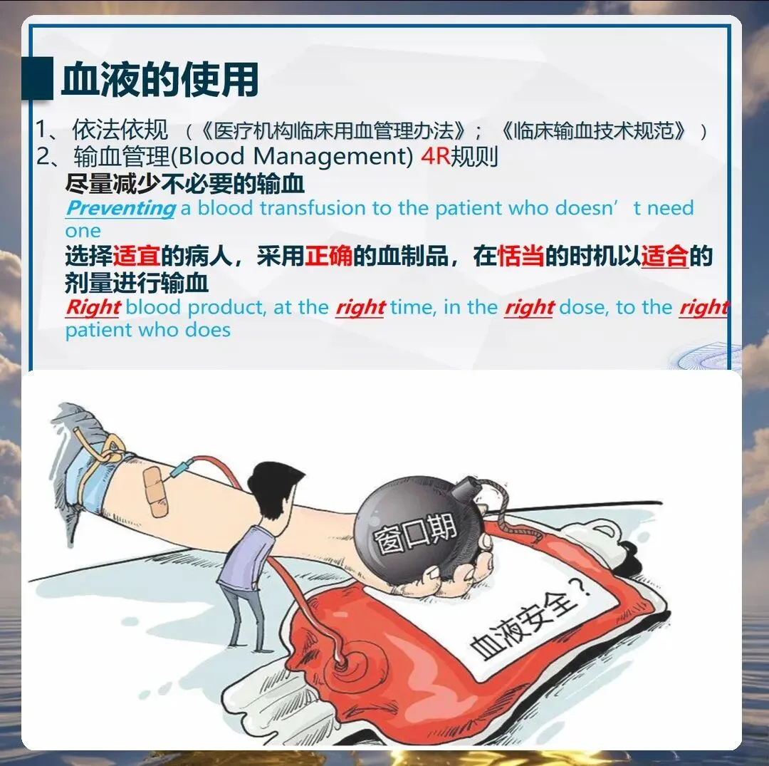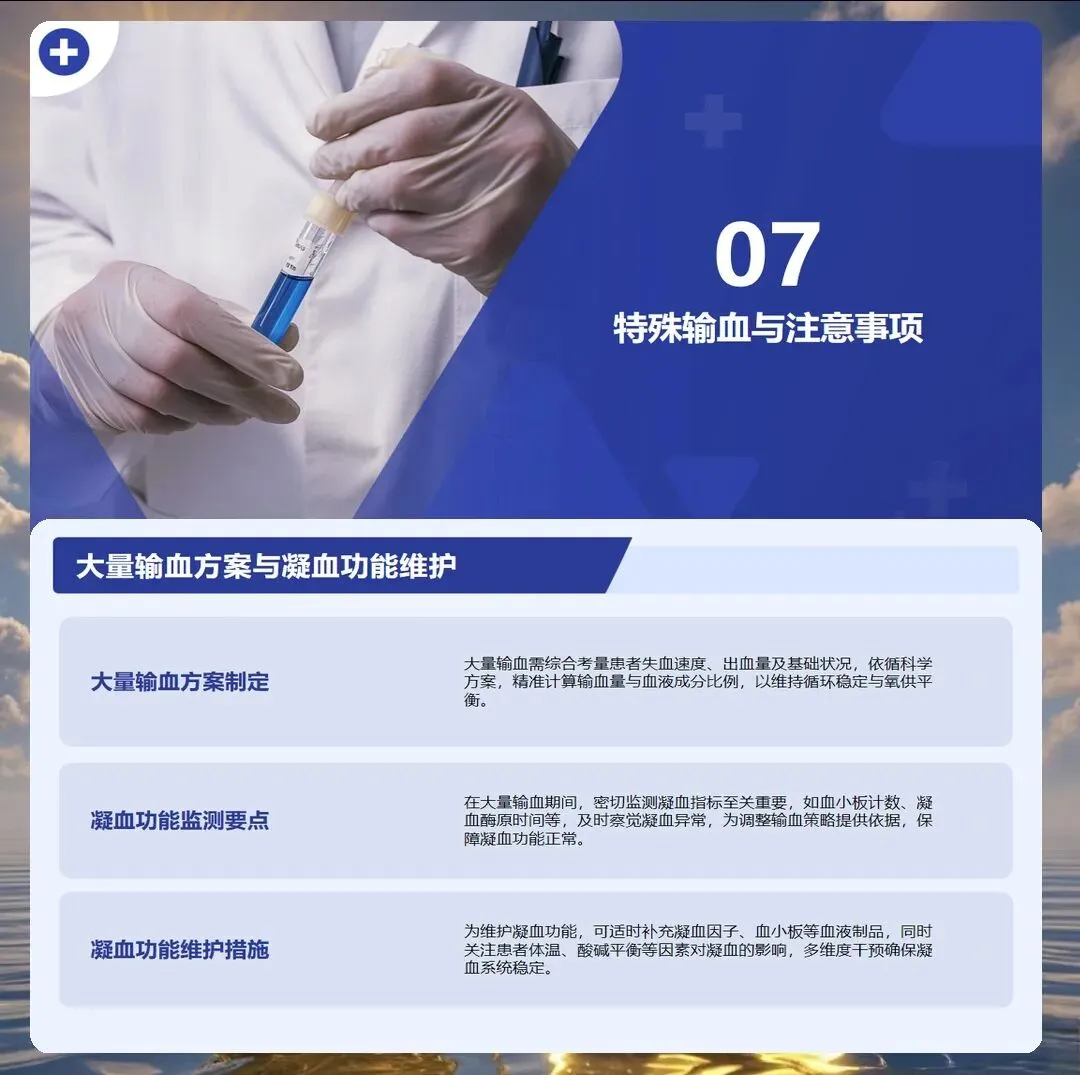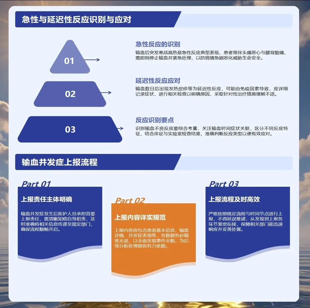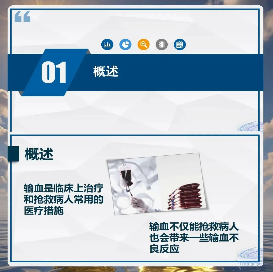 输血不良反应的处理要及时准确。急性溶血反应是最严重的输血并发症,多由血型不合引起,起病急、进展快,可导致休克、肾衰竭、死亡。一旦发生立即停止输血,保持静脉通路通畅,快速补液、利尿、碱化尿液,保护肾功能。过敏反应轻者口服抗组胺药物,重者肌注肾上腺素,保持呼吸道通畅。循环超负荷多见于老年、心功能不全、输血速度过快的患者,表现为呼吸困难、咳嗽、咳粉红色泡沫痰,立即停止输血、半卧位、吸氧、利尿。输血相关急性肺损伤通常在输血六小时内发生,表现为急性呼吸窘迫,需要机械通气支持。