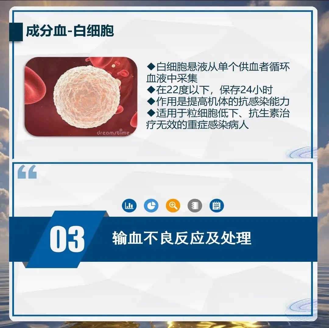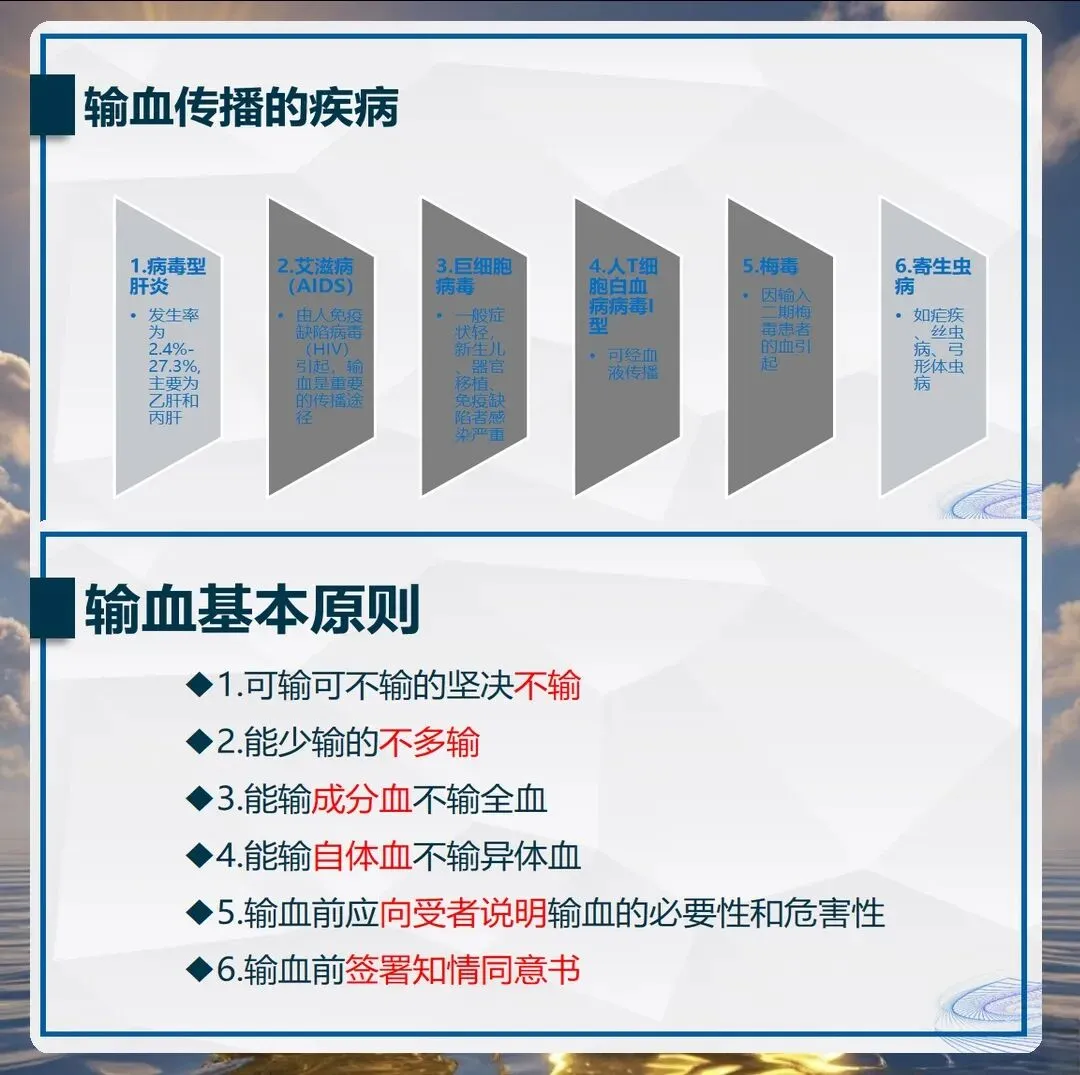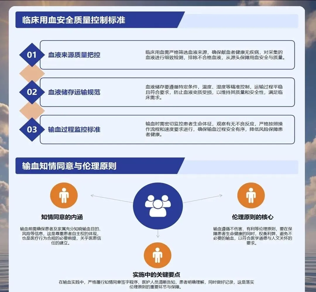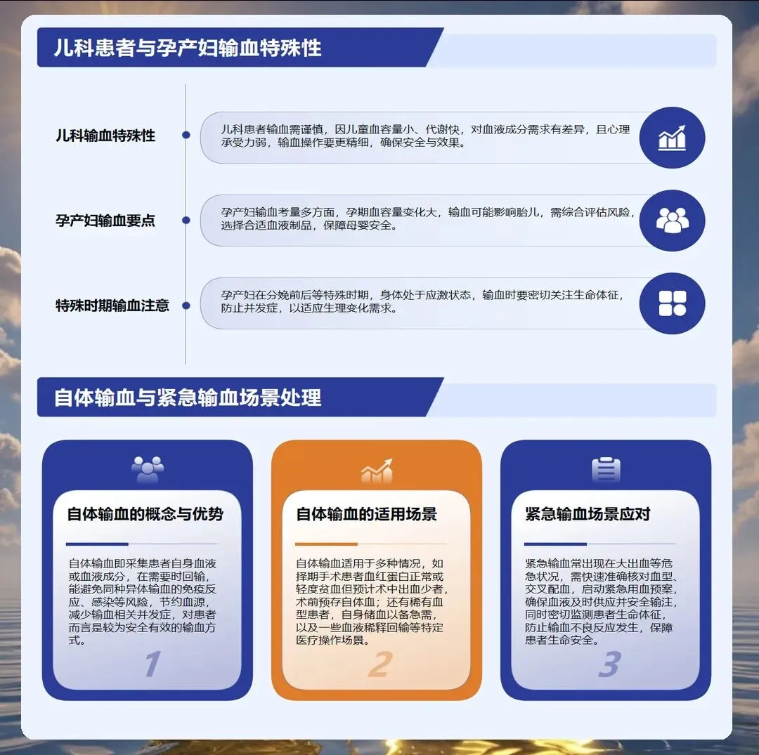 输血不良反应的处理要及时准确。急性溶血反应是最严重的输血并发症,多由血型不合引起,起病急、进展快,可导致休克、肾衰竭、死亡。一旦发生立即停止输血,保持静脉通路通畅,快速补液、利尿、碱化尿液,保护肾功能。过敏反应轻者口服抗组胺药物,重者肌注肾上腺素,保持呼吸道通畅。循环超负荷多见于老年、心功能不全、输血速度过快的患者,表现为呼吸困难、咳嗽、咳粉红色泡沫痰,立即停止输血、半卧位、吸氧、利尿。输血相关急性肺损伤通常在输血六小时内发生,表现为急性呼吸窘迫,需要机械通气支持。