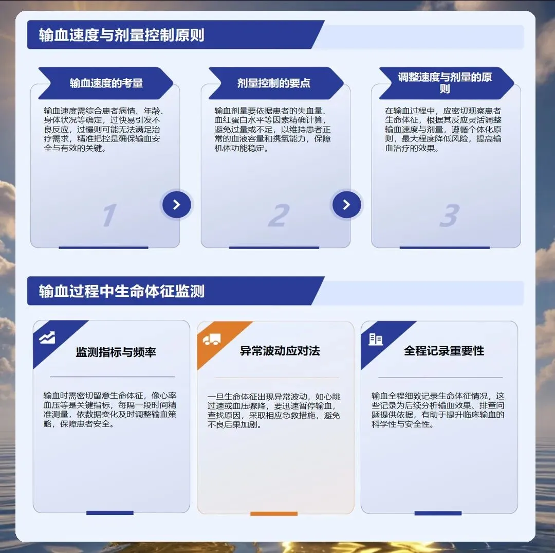 输血速度要严格控制。开始输血的前十五分钟要缓慢输注,每分钟不超过二十滴,密切观察患者有无发热、寒战、皮疹、呼吸困难等反应。无异常反应后可以调整到适当速度,红细胞一般每分钟四十至六十滴,血浆每分钟三十至四十滴,血小板要快速输注,以患者能够耐受为准。老年患者、心功能不全患者、儿童患者要减慢输注速度,避免循环负荷过重引起肺水肿。一次输血不应超过四个单位,确实需要大量输血时要监测凝血功能和电解质变化。