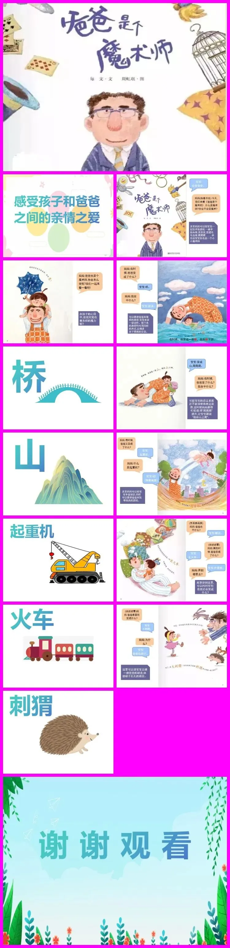 大图书《爸爸是个魔术师》;山、桥、起重机、火车、刺猬的图文卡片。
