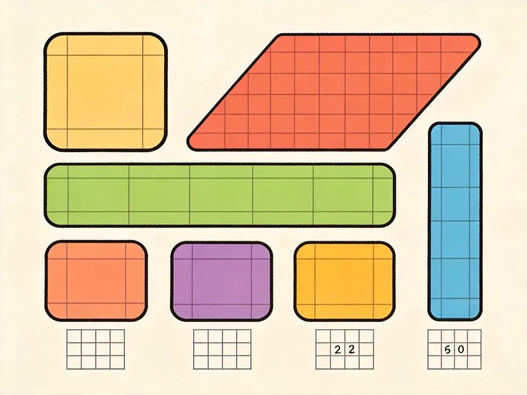 👨🏫 教师活动:将花坛示意图投影到方格纸上,讲解数方格的规则:“同学们看,我们把花坛放在方格纸上,每个小方格是1平方米,满格的我们直接数,不满半格的忽略,满半格的算1格,现在小组合作数一下。”巡视指导小组活动,之后请不同小组汇报结果,引导学生讨论“为什么结果不一样?哪种更合理?”
