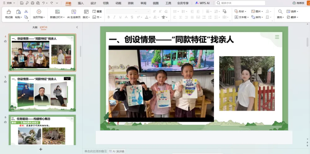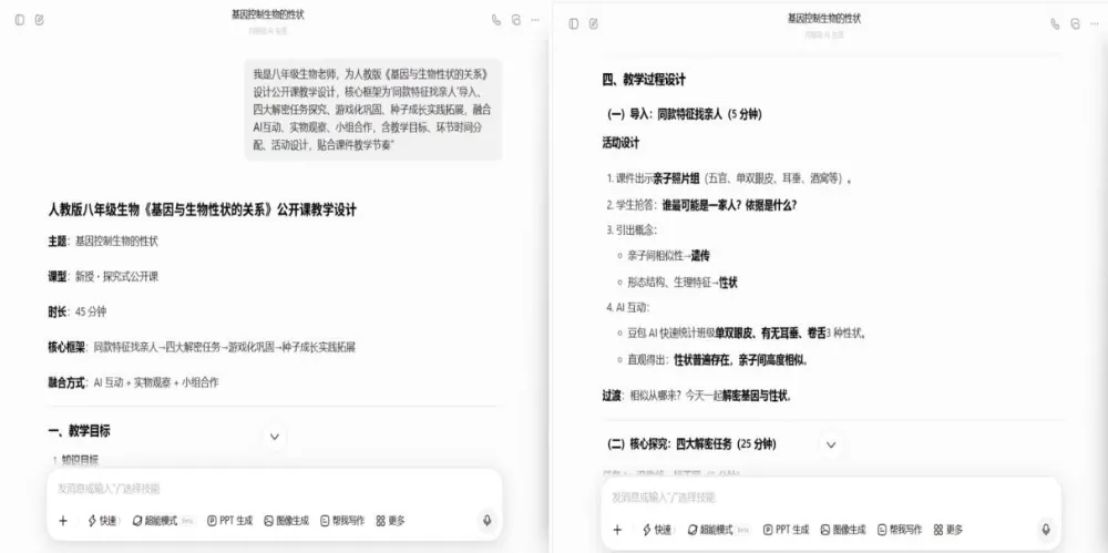 输入精准指令:“我是八年级生物老师,为人教版《基因与生物性状的关系》 一课制作 教学设计,核心框架为‘同款特征找亲人’导入、四大解密任务探究、游戏化巩固、种子成长实践拓展,融合AI互动、实物观察、小组合作,含教学目标、环节时间分配、活动设计,贴合课件教学节奏”。
