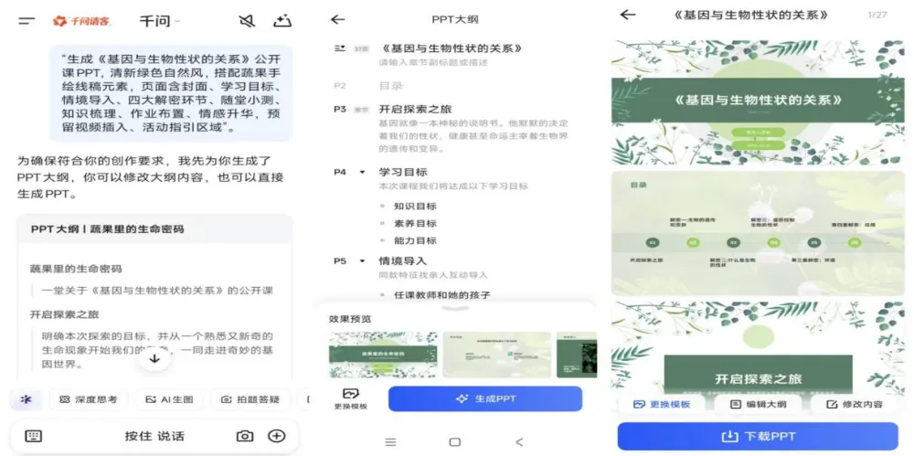输入课件生成指令:“生成《基因与生物性状的关系》公开课PPT,清新绿色自然风,搭配蔬果手绘线稿元素,页面含封面、学习目标、情境导入、四大解密环节、随堂小测、知识梳理、作业布置、情感升华,预留视频插入、活动指引。