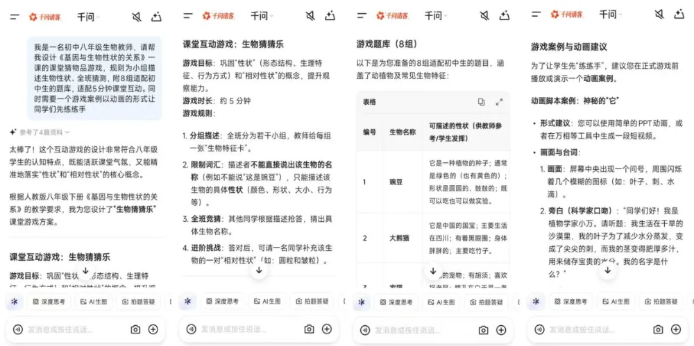 千问生成“性状猜物品”小组游戏:输入指令“设计《基因与生物性状的关系》课堂猜物品游戏,规则为小组描述生物性状、全班猜测,附 8 组适配初中生的题库,适配5分钟课堂互动”,整合进课件对应活动环节。