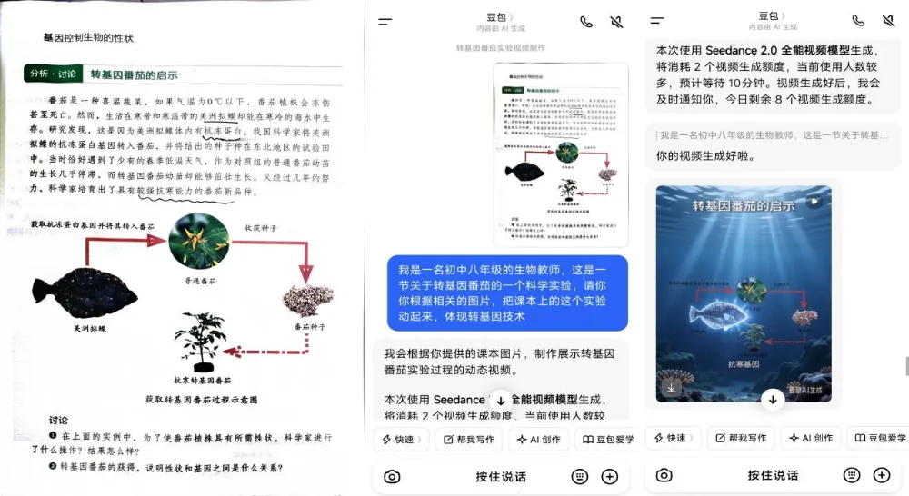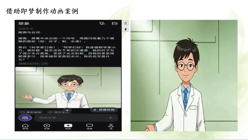 即梦生成动态素材:根据脚本,生成亲子对比动画、基因转移演示动画、种子发芽延时素材等,画面风格与课件统一。