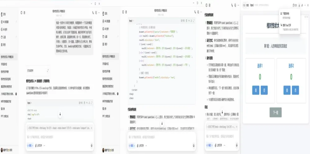 借助豆包编程功能,输入定制化游戏指令,自动生成双人PK课堂小游戏。教师可根据教学需要修改题目、预览效果,完成后将网页游戏下载本地并嵌入课件,实现高效、互动、趣味化巩固。