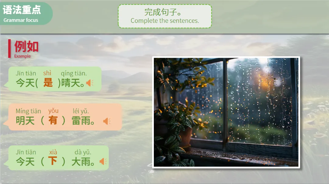 例如,“今天(是)晴天。”、“明天(有)雷雨。”等。这些练习不仅巩固了学生的词汇基础,还培养了他们的语言表达能力。