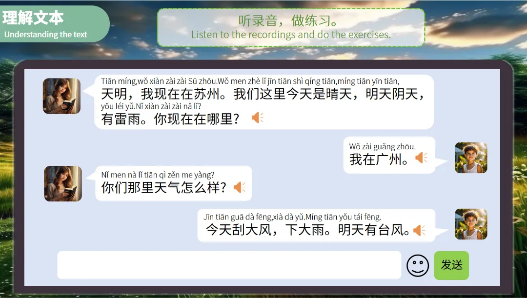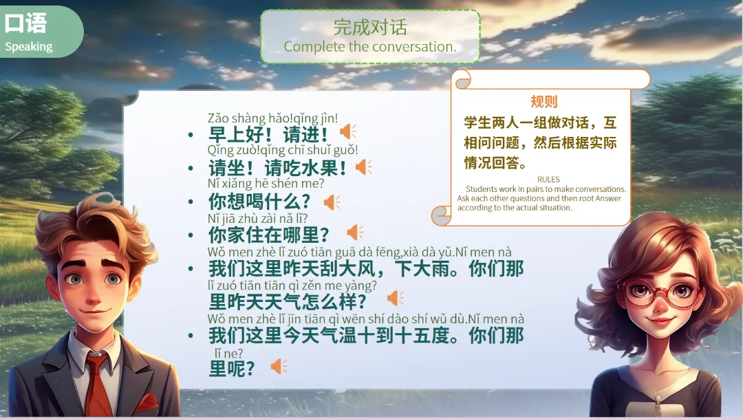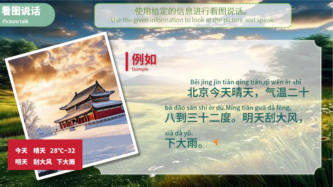 例如,学生可以描述:“北京今天晴天,气温二十八到三十二度。明天刮大风,下大雨。”这样的练习既有趣又实用,能够有效提升学生的口语水平。