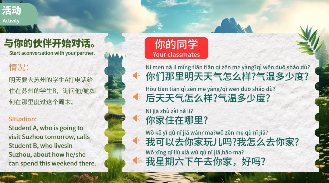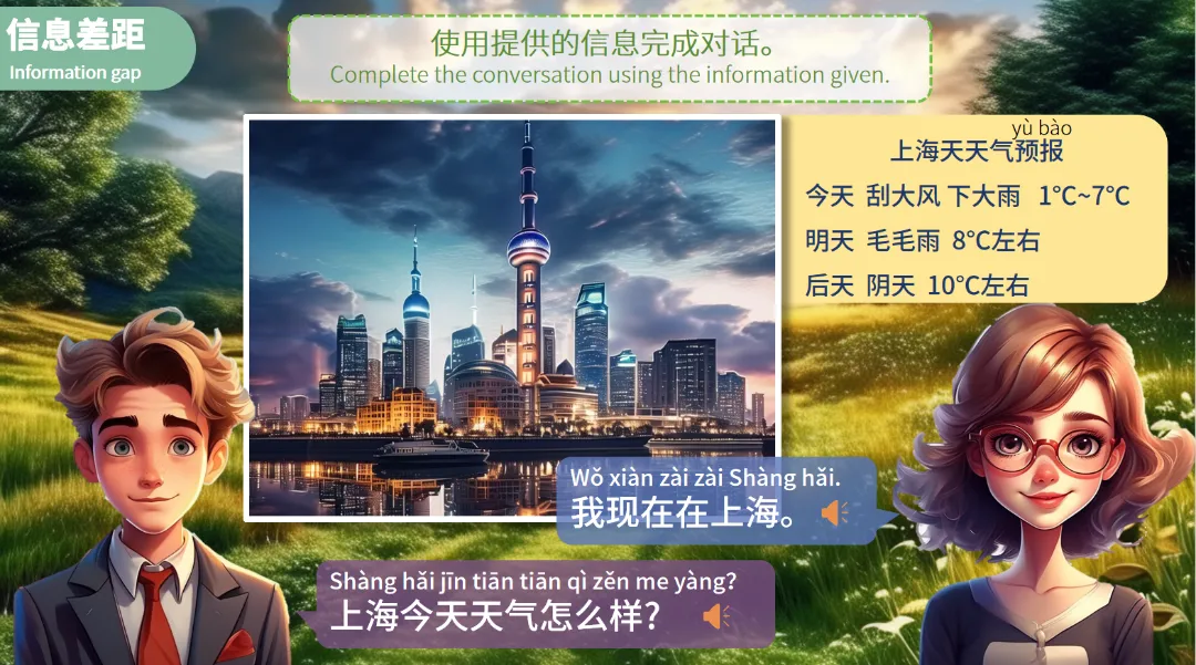 例如,一个学生在上海,另一个学生在其他地方,他们需要通过对话交流各自的天气情况。