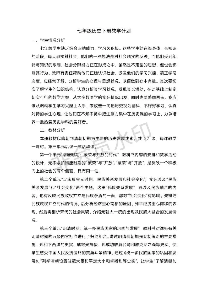 >七年级历史下册教学计划教案