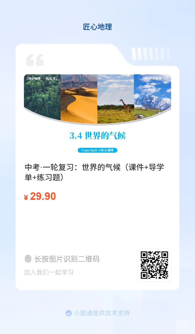方式①:描下方二维码,获取新教材中考地理·一轮复习资料,含课件+导学单+练习题+送七八年级知识填图。(之前买过成套课件者,系统匹配优惠券,立减50)