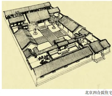 平面布臵:建筑群、轴对称、主屋朝南、有庭院。