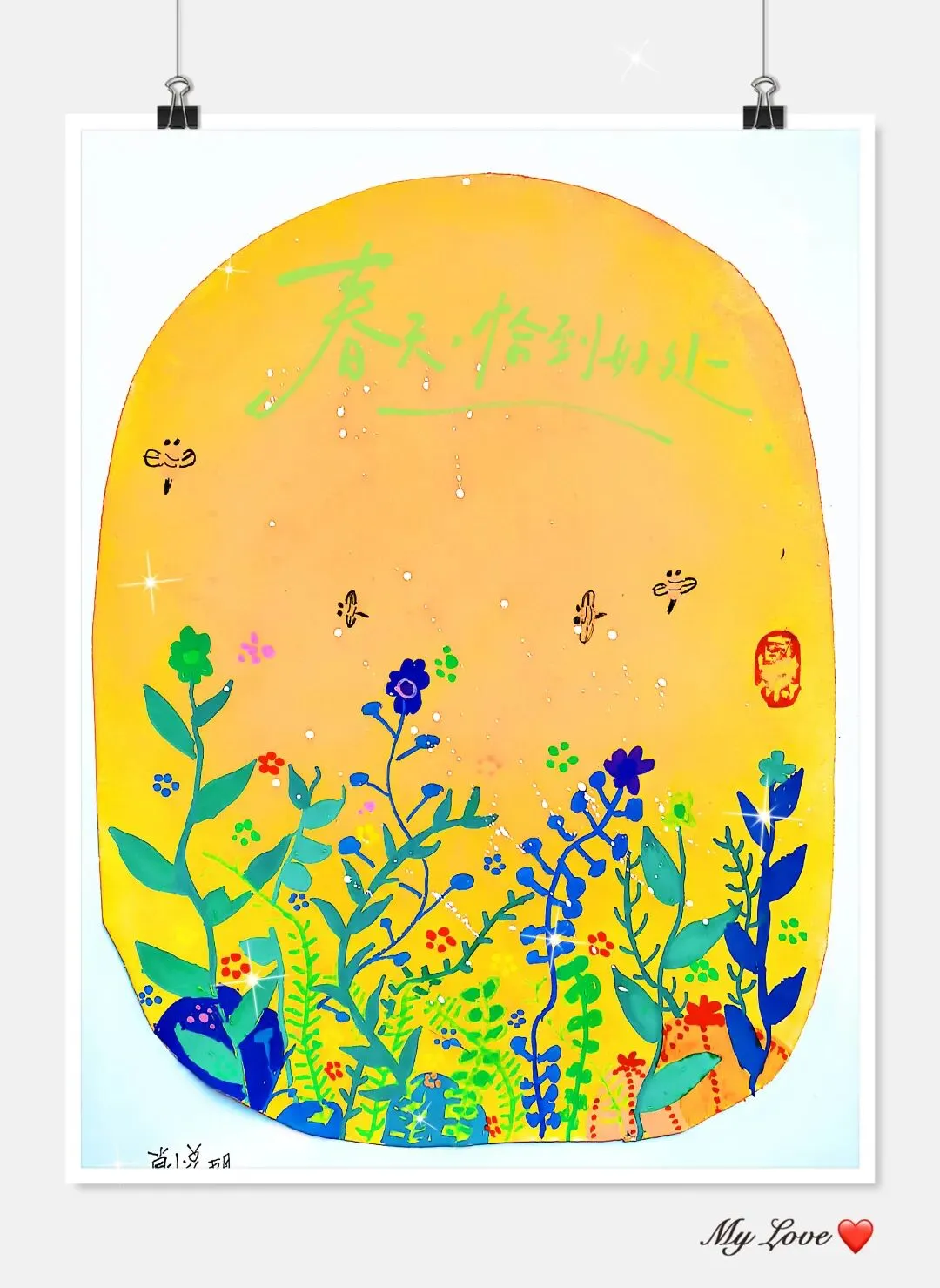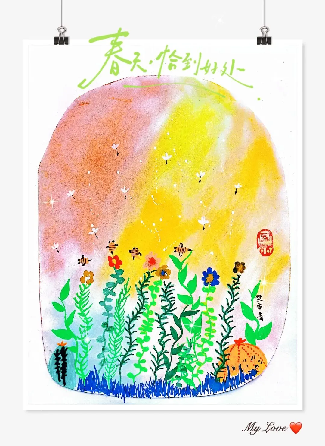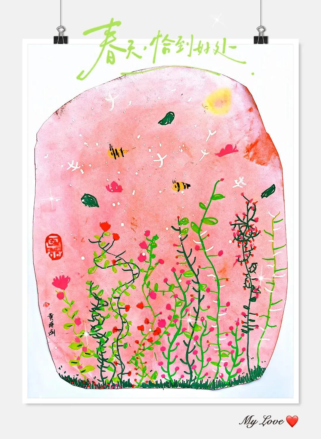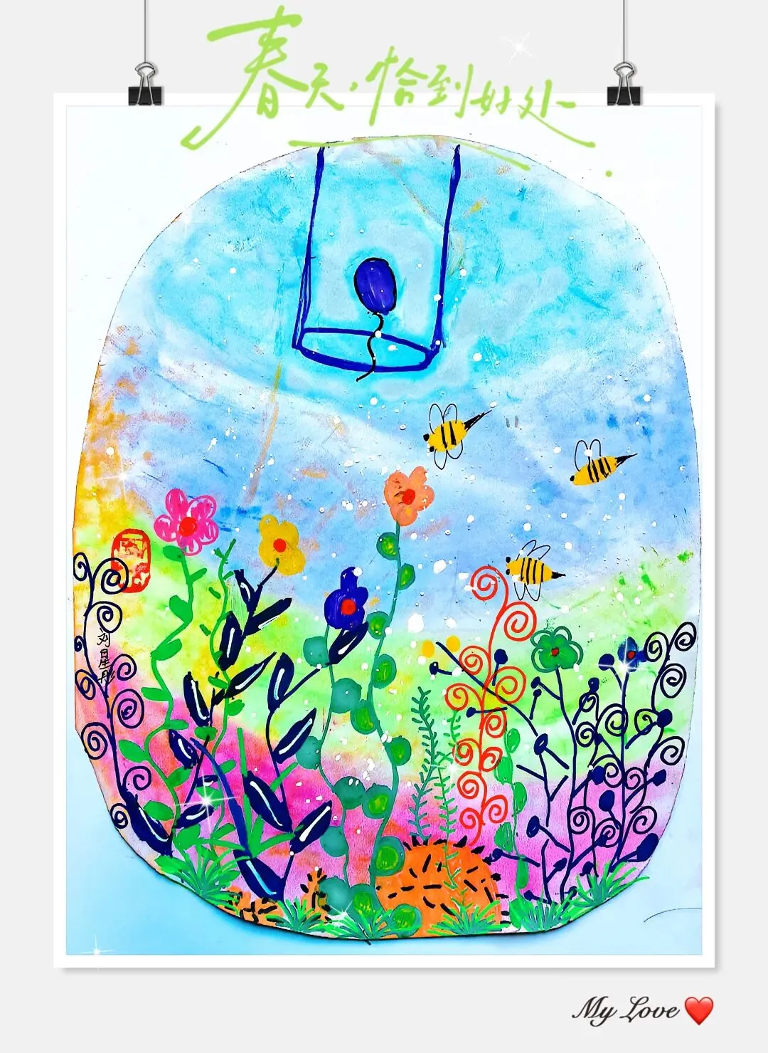 - 让孩子给作品起名字,比如《我的蜜蜂朋友》《飘向春天的蒲公英》,仪式感拉满
