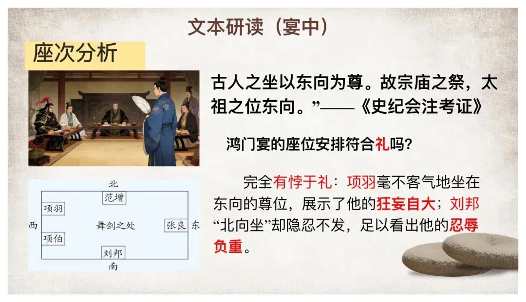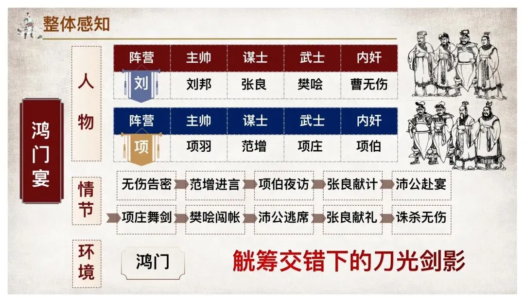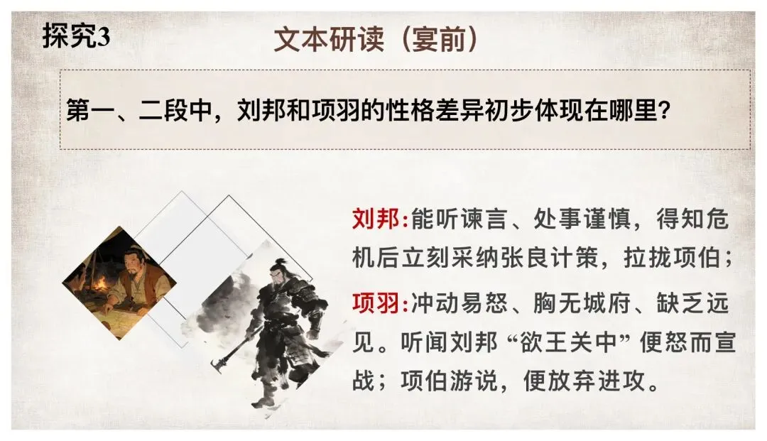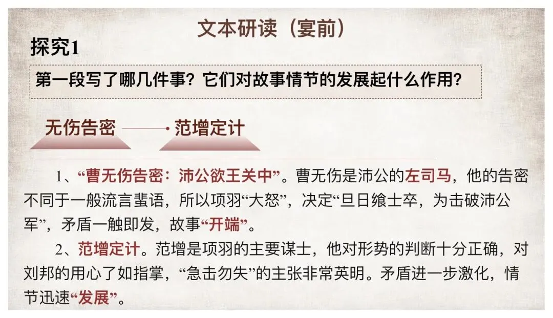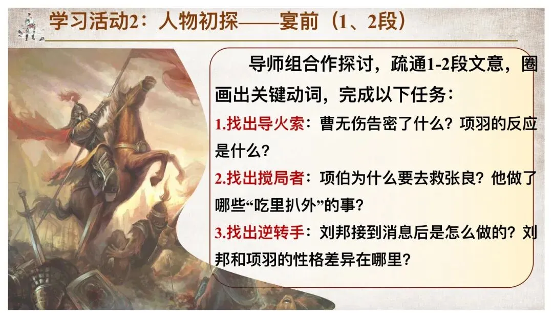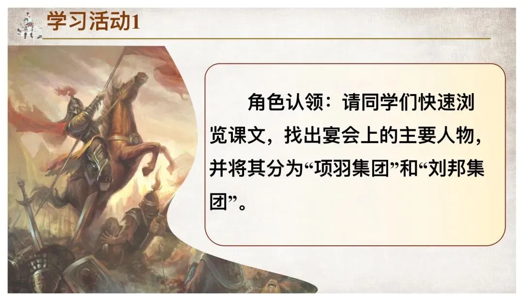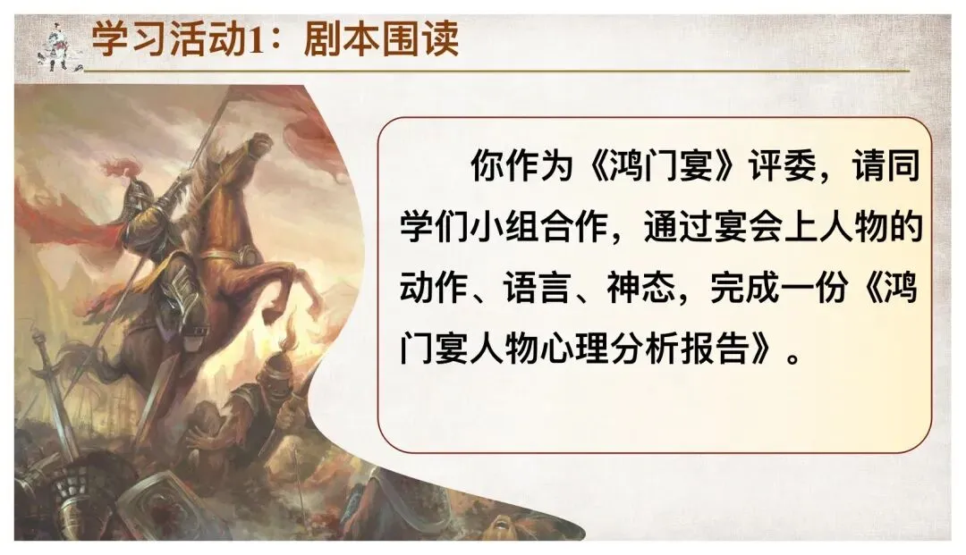 ——一场暗藏杀机的顶级饭局,一堂关于选择与命运的思辨课学习任务群:文学阅读与写作(结合“思辨性阅读与表达”)活动逻辑:从“文言积累” (破译通关密码)到 “文学鉴赏” (分析人物性格与情节张力)再到 “文化思辨” (探讨性格与命运的关系),层层递进。语言建构与运用:通过任务驱动,积累“军、王、夜、活、兄”等重要文言实词的活用现象及特殊句式,疏通文意。思维发展与提升:在对比阅读中,分析刘邦、项羽、张良、范增等人的性格特点,培养逻辑思维与批判性思维(如何看待项羽的“不杀”)。审美鉴赏与创造:赏析司马迁通过个性化语言、动作描写塑造人物的艺术手法,体会《史记》的文学魅力。文化传承与理解:理解楚汉相争的历史文化背景,对“英雄”与“成败”形成自己的价值判断。本校表演社团将组织“演员的诞生”表演节目,本班学生将作为观评《鸿门宴》的评委导师。任务要求:小组合作探究,疏通1-2段文意,圈画出关键动词,完成以下任务:小结:第一课时通过梳理人物关系,我们发现这场宴会其实在开场前,胜负的天平已经开始倾斜。回顾上节课的“关系网”,引出核心问题:刘邦带着诚意(和恐惧)来道歉,宴会上到底发生了什么?情境创设:你作为观评《鸿门宴》的评委,请小组通过宴会上人物的动作、语言、神态,完成一份《鸿门宴人物心理分析报告》。第一组:坐次风云(分析宴会坐次图)提问:按照古代礼仪,项羽的坐次说明了什么?(显示其傲慢自大,根本没把刘邦当平等对手)第二组:范增的焦虑(研读“数目项王,举所佩玉玦以示之者三”)提问:范增为什么“急”?如果你是范增,此时内心独白是什么?以上为部分内容,需要完整版课件的朋友可以关注我们的公众号,在后台与我们联系。