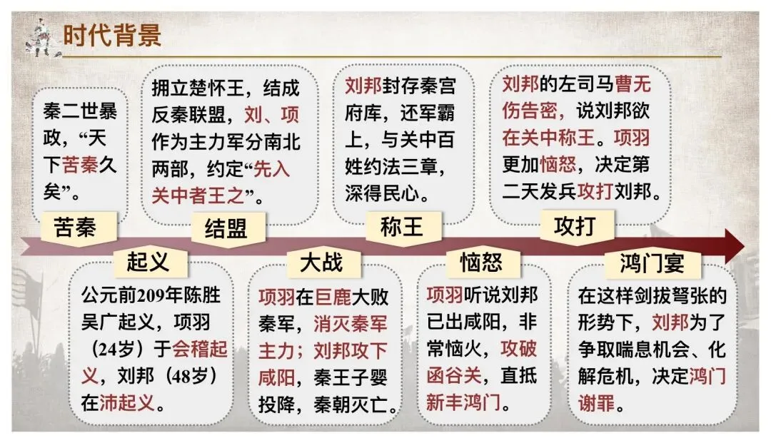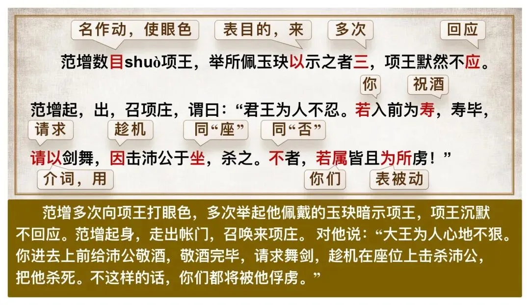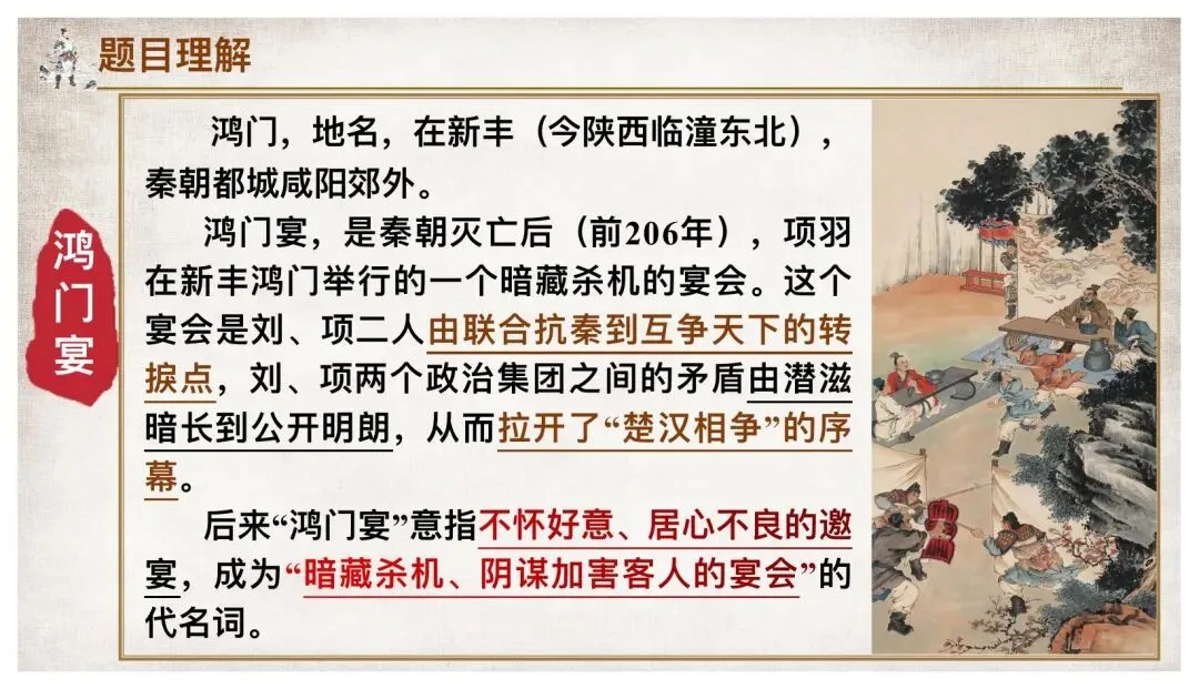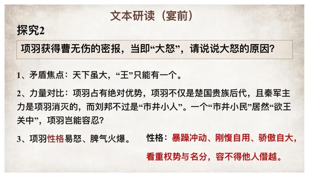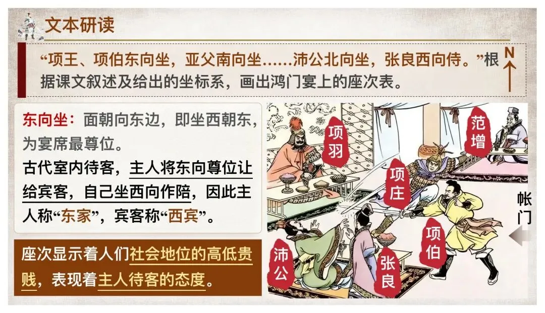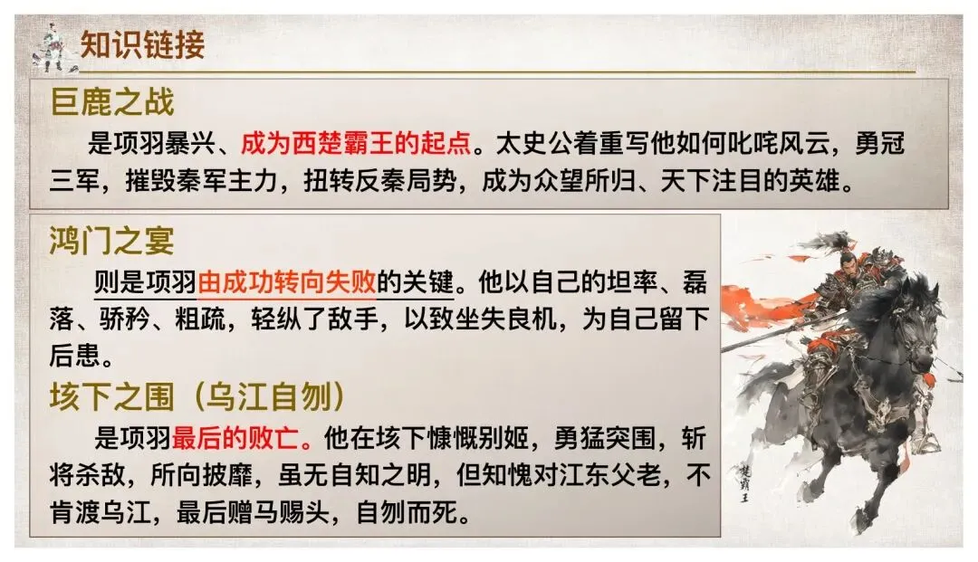 ——一场暗藏杀机的顶级饭局,一堂关于选择与命运的思辨课学习任务群:文学阅读与写作(结合“思辨性阅读与表达”)活动逻辑:从“文言积累” (破译通关密码)到 “文学鉴赏” (分析人物性格与情节张力)再到 “文化思辨” (探讨性格与命运的关系),层层递进。语言建构与运用:通过任务驱动,积累“军、王、夜、活、兄”等重要文言实词的活用现象及特殊句式,疏通文意。思维发展与提升:在对比阅读中,分析刘邦、项羽、张良、范增等人的性格特点,培养逻辑思维与批判性思维(如何看待项羽的“不杀”)。审美鉴赏与创造:赏析司马迁通过个性化语言、动作描写塑造人物的艺术手法,体会《史记》的文学魅力。文化传承与理解:理解楚汉相争的历史文化背景,对“英雄”与“成败”形成自己的价值判断。本校表演社团将组织“演员的诞生”表演节目,本班学生将作为观评《鸿门宴》的评委导师。任务要求:小组合作探究,疏通1-2段文意,圈画出关键动词,完成以下任务:小结:第一课时通过梳理人物关系,我们发现这场宴会其实在开场前,胜负的天平已经开始倾斜。回顾上节课的“关系网”,引出核心问题:刘邦带着诚意(和恐惧)来道歉,宴会上到底发生了什么?情境创设:你作为观评《鸿门宴》的评委,请小组通过宴会上人物的动作、语言、神态,完成一份《鸿门宴人物心理分析报告》。第一组:坐次风云(分析宴会坐次图)提问:按照古代礼仪,项羽的坐次说明了什么?(显示其傲慢自大,根本没把刘邦当平等对手)第二组:范增的焦虑(研读“数目项王,举所佩玉玦以示之者三”)提问:范增为什么“急”?如果你是范增,此时内心独白是什么?以上为部分内容,需要完整版课件的朋友可以关注我们的公众号,在后台与我们联系。