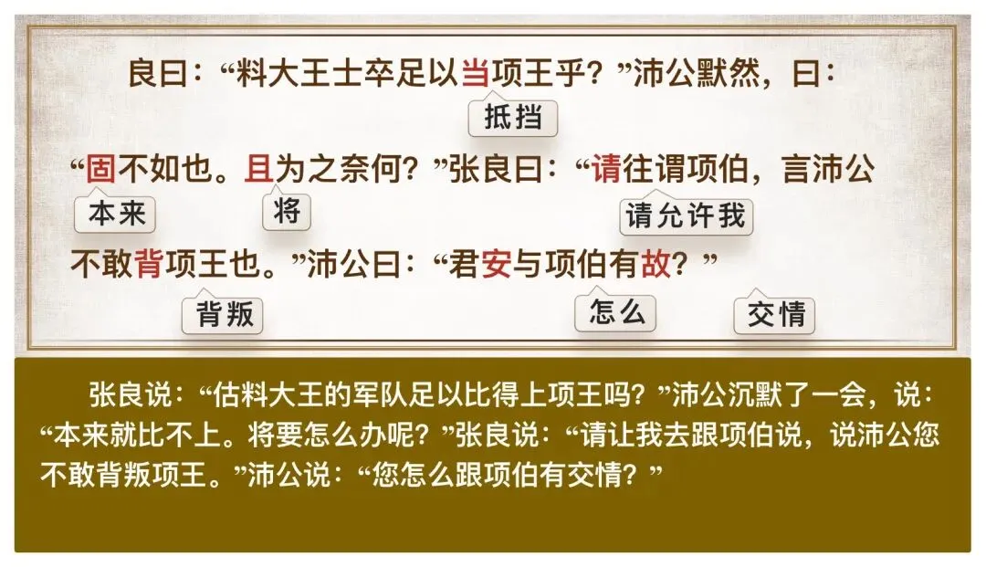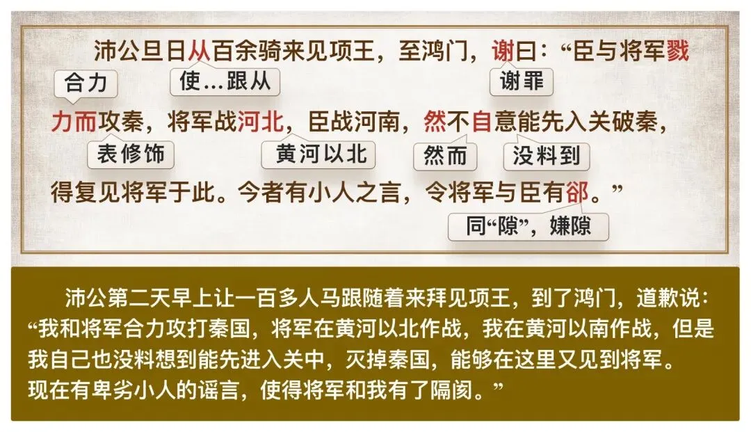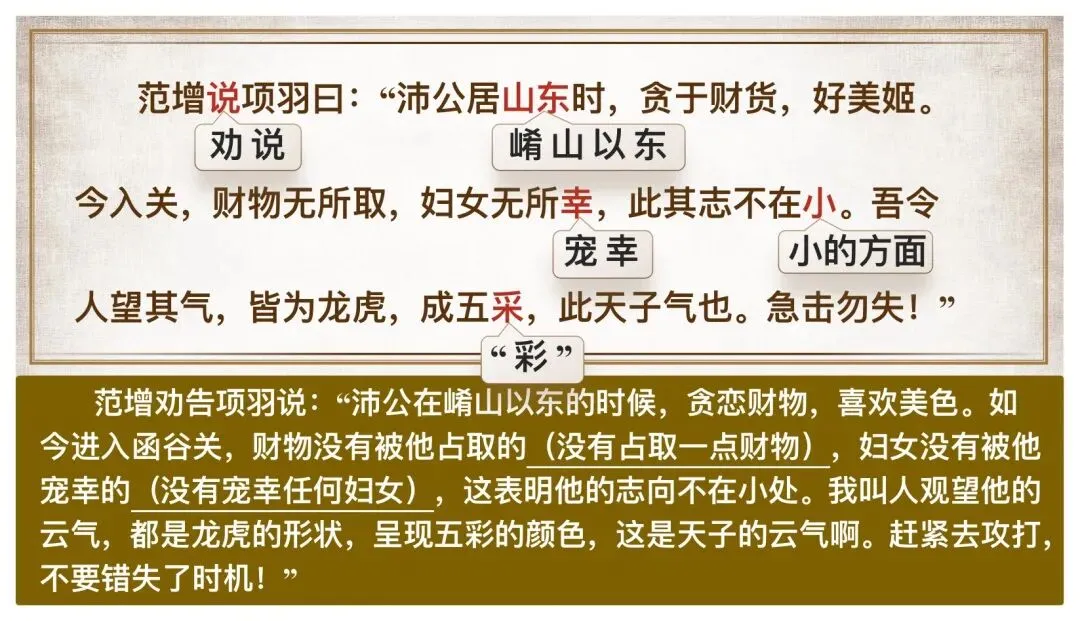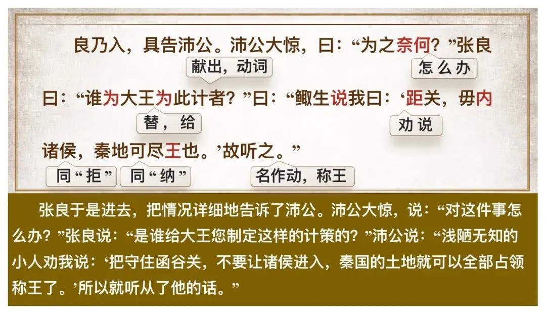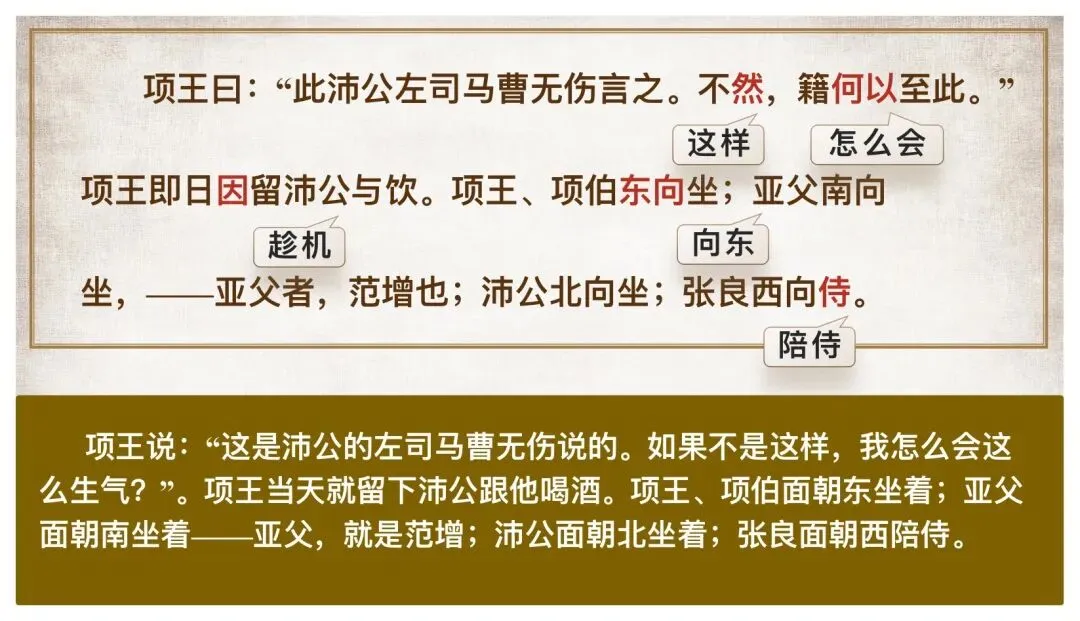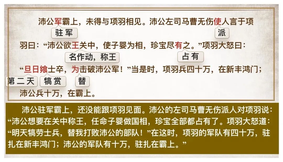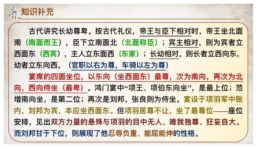 ——一场暗藏杀机的顶级饭局,一堂关于选择与命运的思辨课学习任务群:文学阅读与写作(结合“思辨性阅读与表达”)活动逻辑:从“文言积累” (破译通关密码)到 “文学鉴赏” (分析人物性格与情节张力)再到 “文化思辨” (探讨性格与命运的关系),层层递进。语言建构与运用:通过任务驱动,积累“军、王、夜、活、兄”等重要文言实词的活用现象及特殊句式,疏通文意。思维发展与提升:在对比阅读中,分析刘邦、项羽、张良、范增等人的性格特点,培养逻辑思维与批判性思维(如何看待项羽的“不杀”)。审美鉴赏与创造:赏析司马迁通过个性化语言、动作描写塑造人物的艺术手法,体会《史记》的文学魅力。文化传承与理解:理解楚汉相争的历史文化背景,对“英雄”与“成败”形成自己的价值判断。本校表演社团将组织“演员的诞生”表演节目,本班学生将作为观评《鸿门宴》的评委导师。任务要求:小组合作探究,疏通1-2段文意,圈画出关键动词,完成以下任务:小结:第一课时通过梳理人物关系,我们发现这场宴会其实在开场前,胜负的天平已经开始倾斜。回顾上节课的“关系网”,引出核心问题:刘邦带着诚意(和恐惧)来道歉,宴会上到底发生了什么?情境创设:你作为观评《鸿门宴》的评委,请小组通过宴会上人物的动作、语言、神态,完成一份《鸿门宴人物心理分析报告》。第一组:坐次风云(分析宴会坐次图)提问:按照古代礼仪,项羽的坐次说明了什么?(显示其傲慢自大,根本没把刘邦当平等对手)第二组:范增的焦虑(研读“数目项王,举所佩玉玦以示之者三”)提问:范增为什么“急”?如果你是范增,此时内心独白是什么?以上为部分内容,需要完整版课件的朋友可以关注我们的公众号,在后台与我们联系。