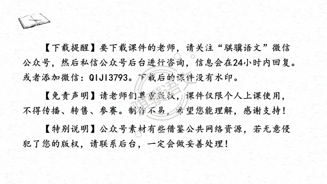 【下载提醒】要下载课件的老师,请关注“骐骥语文”微信公众号,然后私信公众号后台进行咨询,信息会在24小时内回复。或者添加微信:QIJI3793。下载后的课件没有水印。